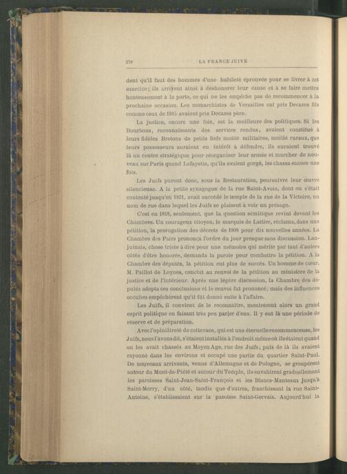 C’est en 1818, seulement, que la question sémitique revint devant les Chambres. Un courageux citoyen, le marquis de Lattier, réclama, dans une pétition, la prorogation des décrets de 1808 pour dix nouvelles années. La Chambre des Pairs prononça l’ordre du jour presque sans discussion. Lan- juinais, chose triste à dire pour une mémoire qui mérite par tant d'autres côtés d’être honorée, demanda la parole pour combattre la pétition. A la Chambre des députés, la pétition eut plus de succès. Un homme de cœur, M. Paillot de Loynes, conclut au renvoi de la pétition au ministère de la justice et de l’intérieur. Après une légère discussion, la Chambre des députés adopta ces conclusions et le renvoi fut prononcé ; mais des influences occultes empêchèrent qu’il fût donné suite à l’affaire.