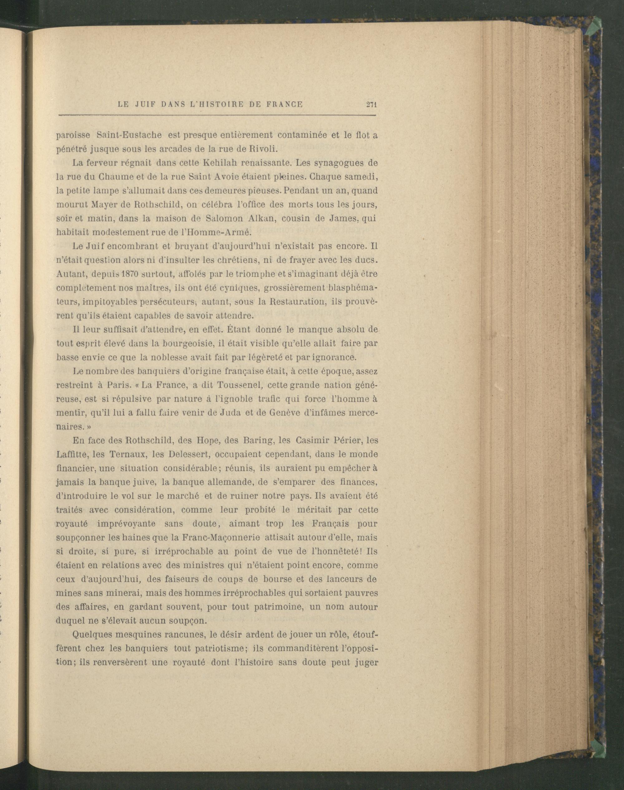 Le nombre des banquiers d’origine française était, à cette époque, assez restreint à Paris . « La France, a dit Toussenel , cette grande nation généreuse, est si répulsive par nature à l'ignoble trafic qui force l’homme à mentir, qu’il lui a fallu faire venir de Juda et de Genève d’infâmes mercenaires. »