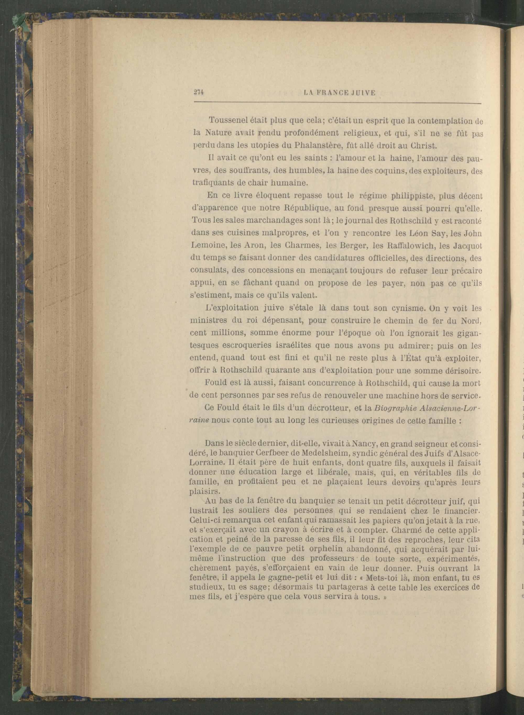 En ce livre éloquent repasse tout le régime philippiste, plus décent d’apparence que notre République, au fond presque aussi pourri qu’elle. Tous les sales marchandages sont là; le journal des Rothschild y est raconté dans ses cuisines malpropres, et l’on y rencontre les Léon Say , les John Lemoine, les Aron, les Charmes, les Berger, les Ralï'alowich, les Jacquot du temps se faisant donner des candidatures officielles, des directions, des consulats, des concessions en menaçant toujours de refuser leur précaire appui, en se fâchant quand on propose de les payer, non pas ce qu’ils s’estiment, mais ce qu’ils valent.
