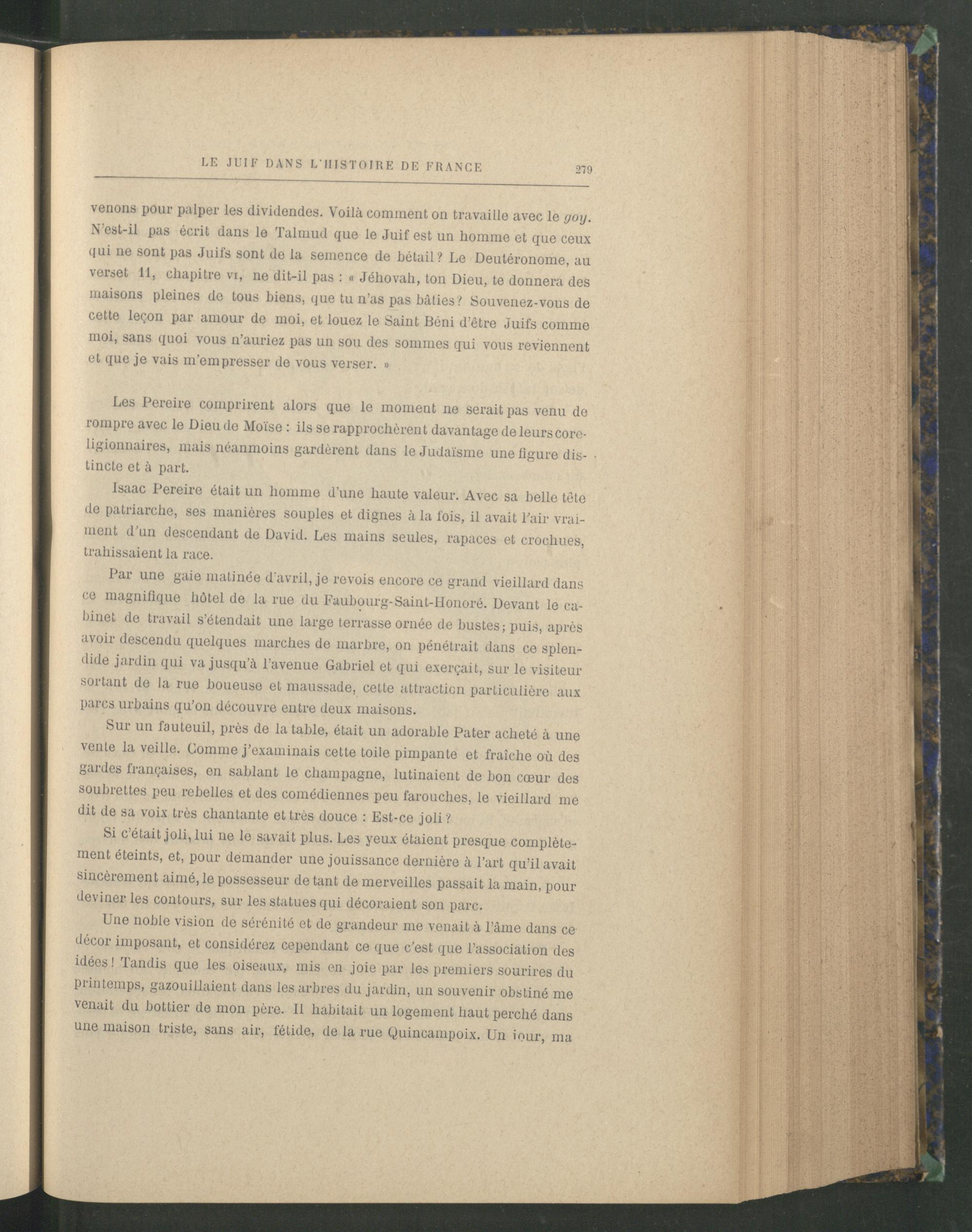 Isaac Pereire était un homme d’une haute valeur. Avec sa belle tète de patriarche, ses manières souples et dignes à la fois, il avait l’air vraiment d’un descendant de David. Les mains seules, rapaces et crochues, trahissaient la race.