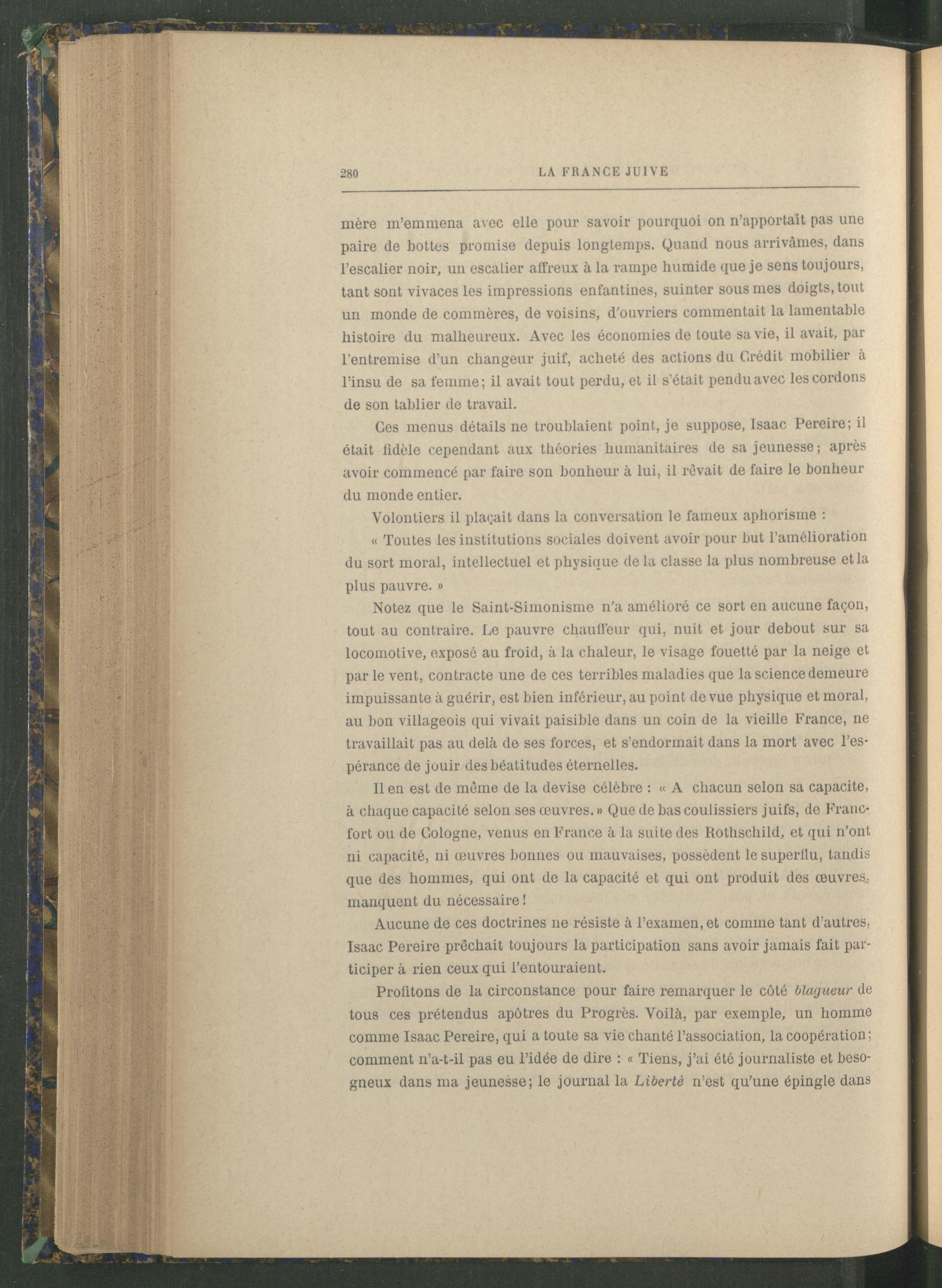 Il en est de même de la devise célèbre : « A chacun selon sa capacité, à chaque capacité selon ses œuvres.» Que de bascoulissiers juifs, de Franc fort ou de Cologne , venus en France à la suite des Rothschild , et qui n’ont ni capacité, ni œuvres bonnes ou mauvaises, possèdent le superllu, tandis que des hommes, qui ont de la capacité et qui ont produit des œuvres., manquent du nécessaire !