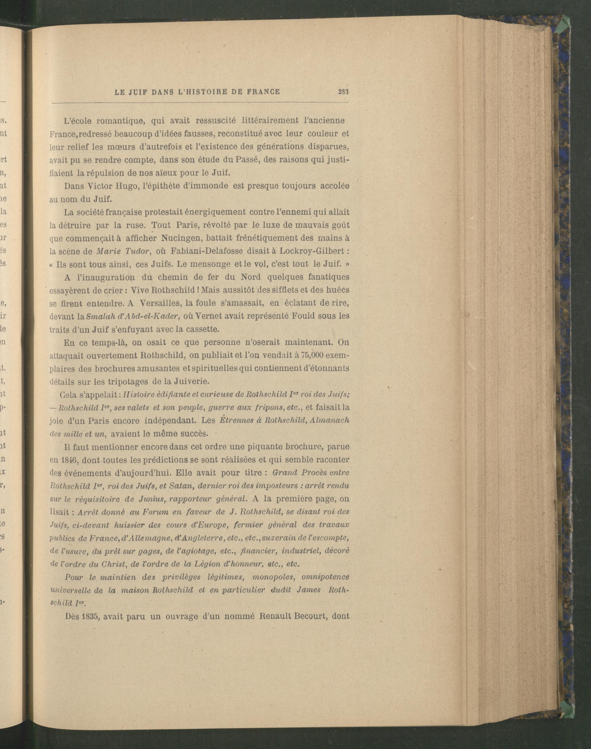 L’école romantique, qui avait ressuscité littérairement l’ancienne France , redressé beaucoup d’idées fausses, reconstitué avec leur couleur et leur relief les mœurs d’autrefois et l’existence des générations disparues, avait pu se rendre compte, dans son étude du Passé, des raisons qui justifiaient la répulsion de nos aïeux pour le Juif.