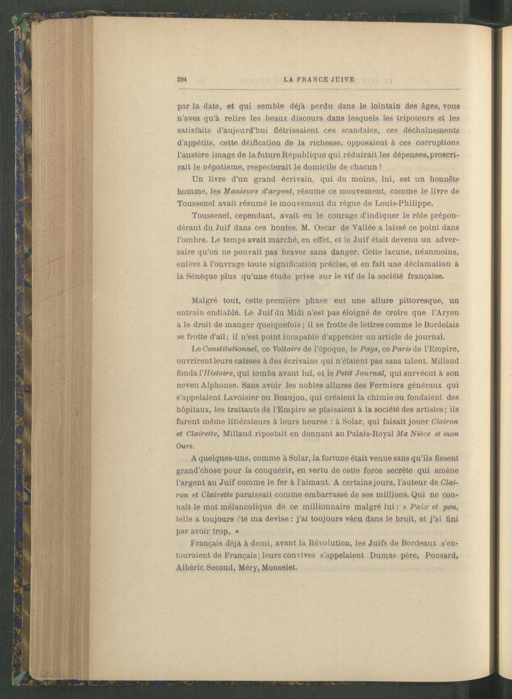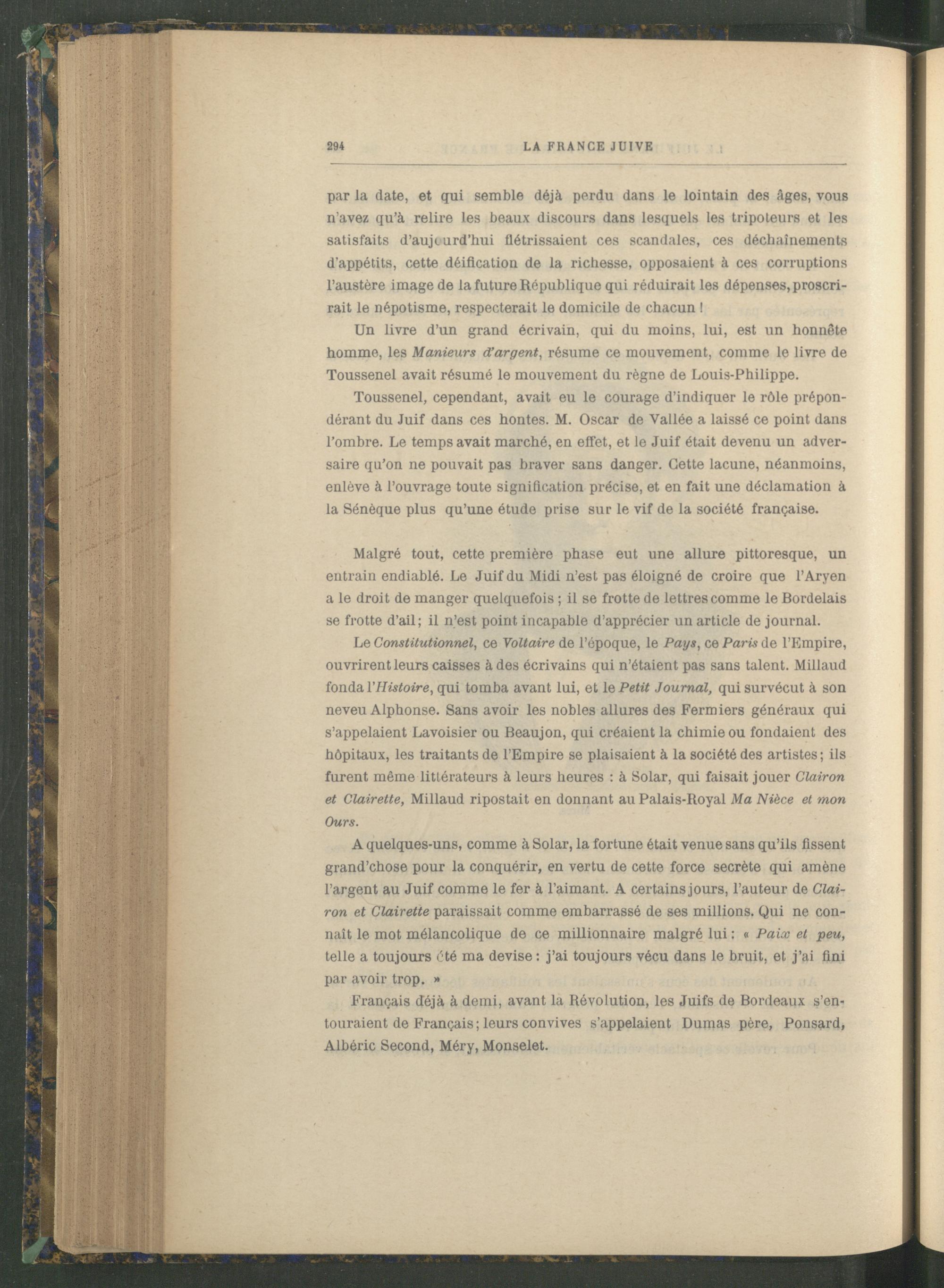 Toussenel , cependant, avait eu le courage d’indiquer le rôle prépondérant du Juif dans ces hontes. M. Oscar de Vallée a laissé ce point dans l’ombre. Le temps avait marché, en effet, et le Juif était devenu un adversaire qu’on ne pouvait pas braver sans danger. Cette lacune, néanmoins, enlève à l’ouvrage toute signification précise, et en fait une déclamation à la Sénèque plus qu’une étude prise sur le vif de la société française.