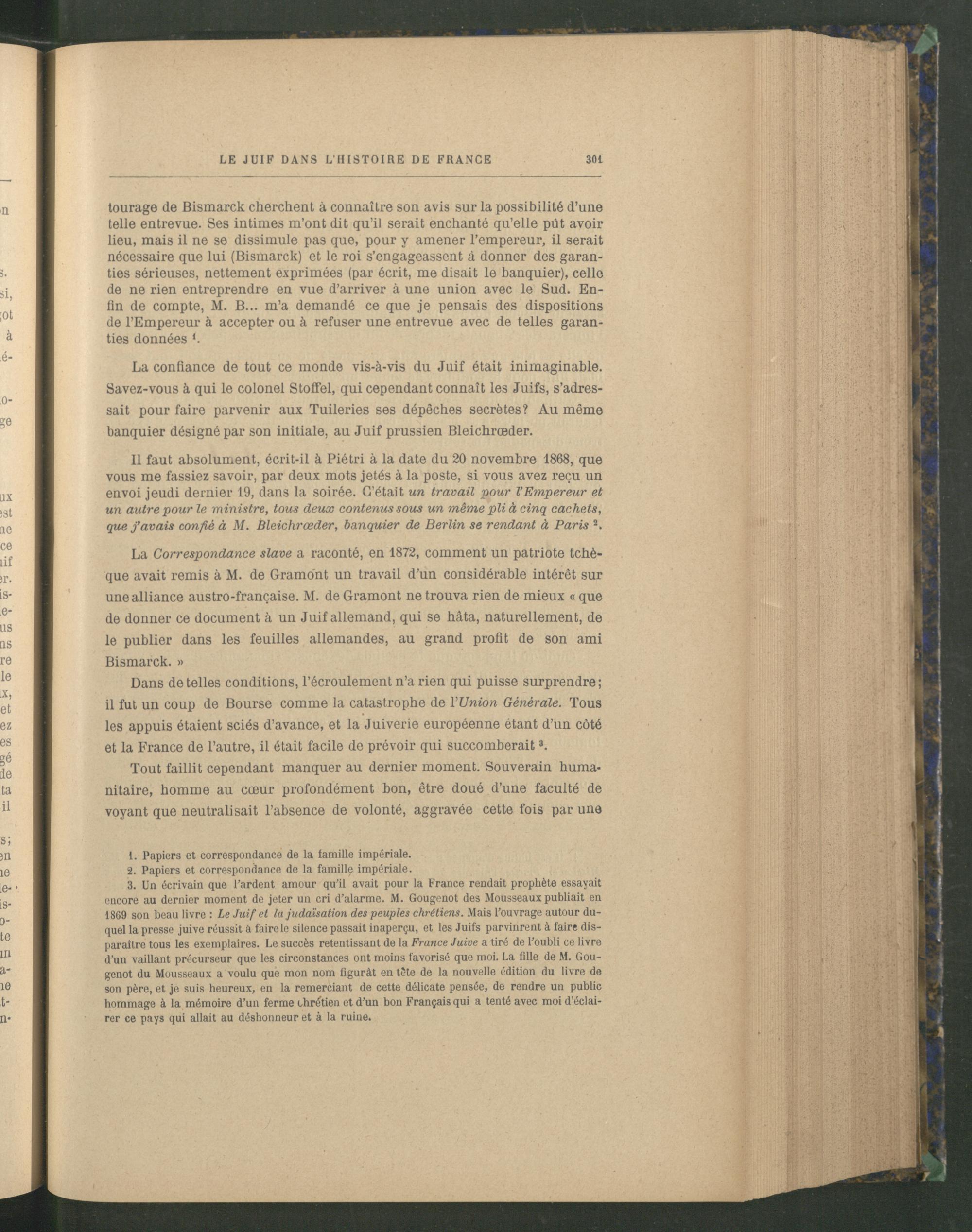 La confiance de tout ce monde vis-à-vis du Juif était inimaginable. Savez-vous à qui le colonel Stoffel, qui cependant connaît les Juifs, s’adressait pour faire parvenir aux Tuileries ses dépêches secrètes? Au même banquier désigné par son initiale, au Juif prussien Bleichrœder.