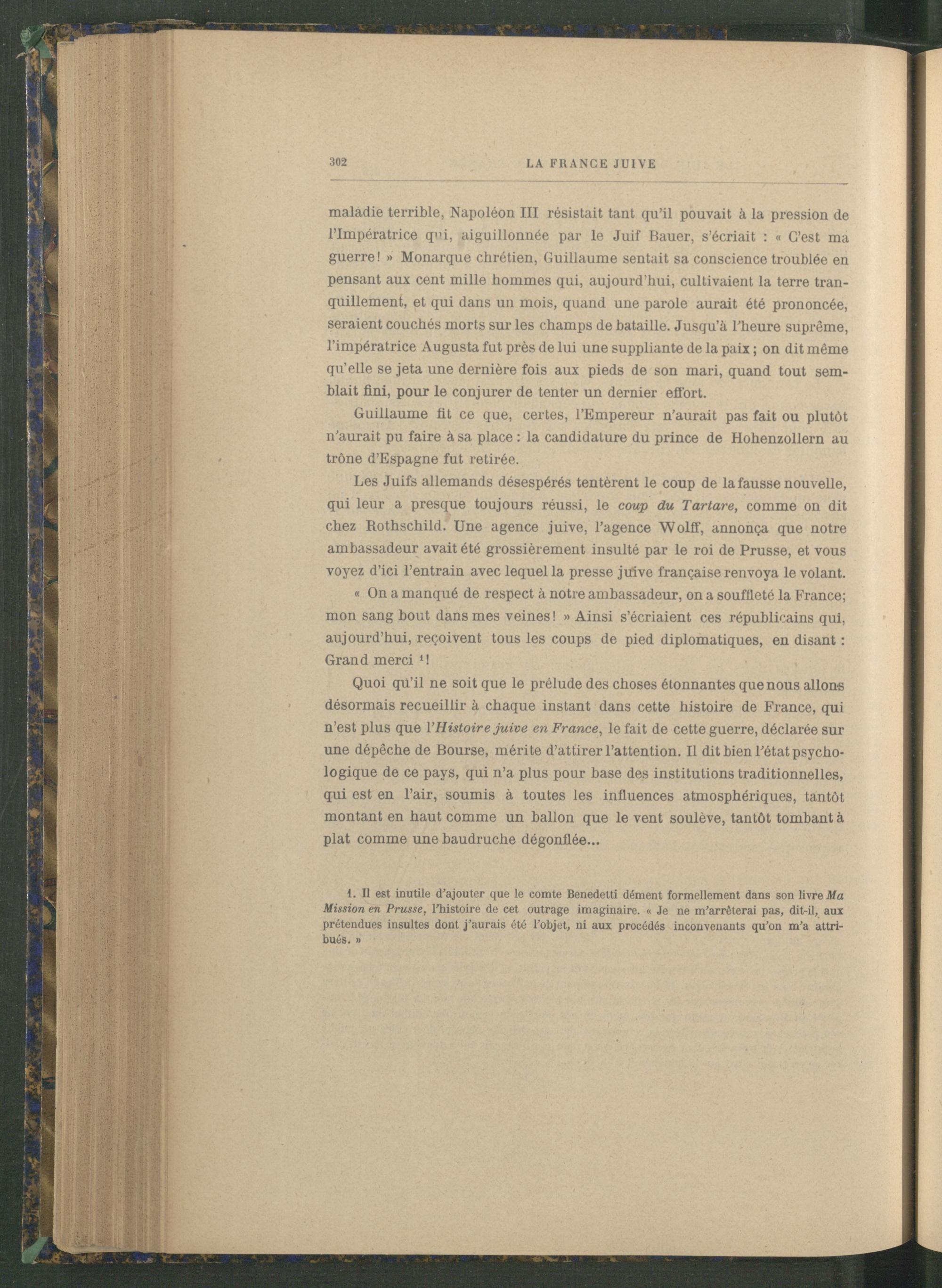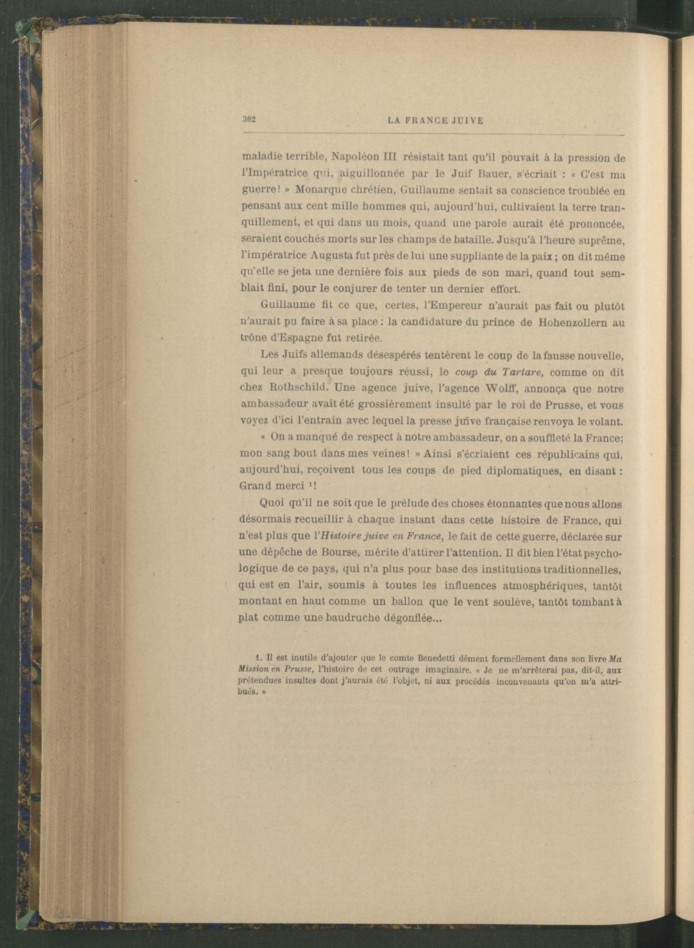 Les Juifs allemands désespérés tentèrent le coup de la fausse nouvelle, qui leur a presque toujours réussi, le coup du Tartare, comme on dit chez Rothschild . Une agence juive, l’agence Wolff, annonça que notre ambassadeur avait été grossièrement insulté par le roi de Prusse, et vous voyez d’ici l’entrain avec lequel la presse juive française renvoya le volant.