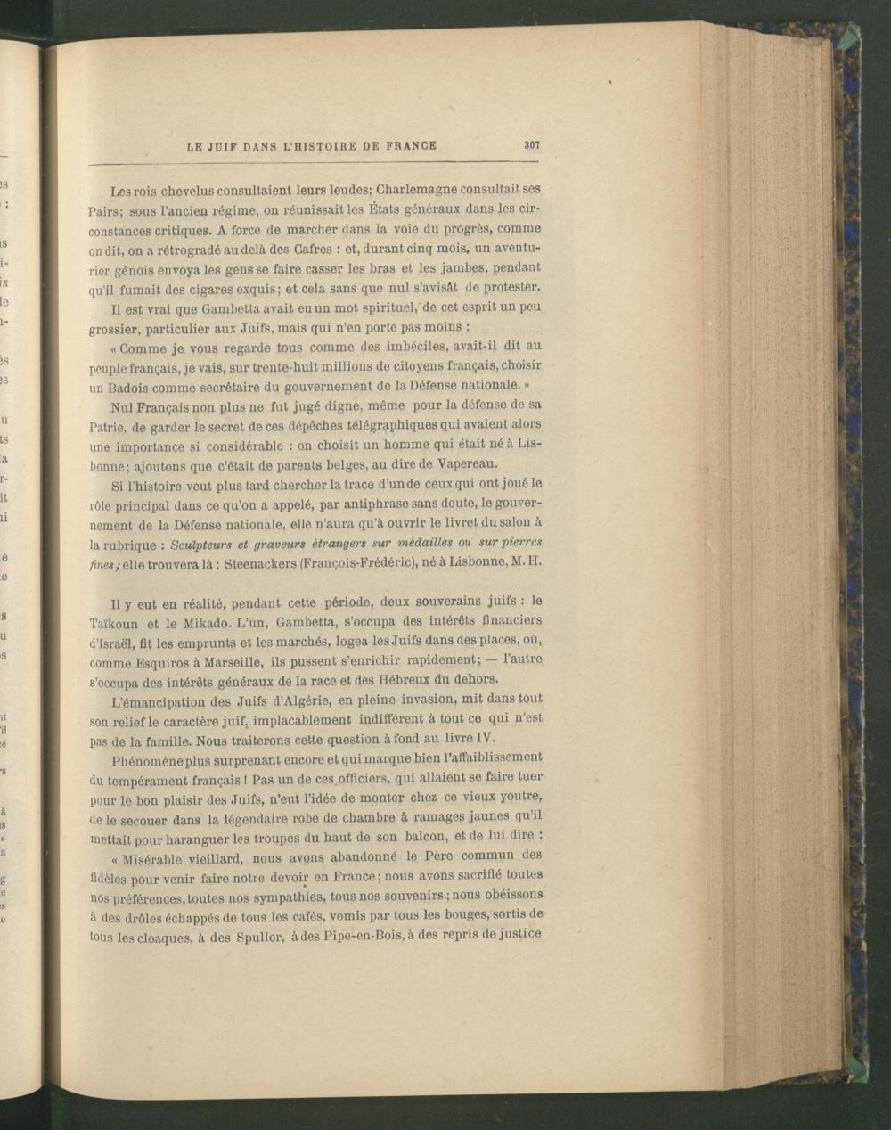 11 y eut en réalité, pendant cette période, deux souverains juifs : le Taïkoun et le Mikado. L’un, Gambetta, s’occupa des intérêts financiers d’Israël , fit les emprunts et les marchés, logea les Juifs dans des places, où, comme Esquiros à Marseille , ils pussent s’enrichir rapidement; — l’autre s’occupa des intérêts généraux de la race et des Hébreux du dehors.