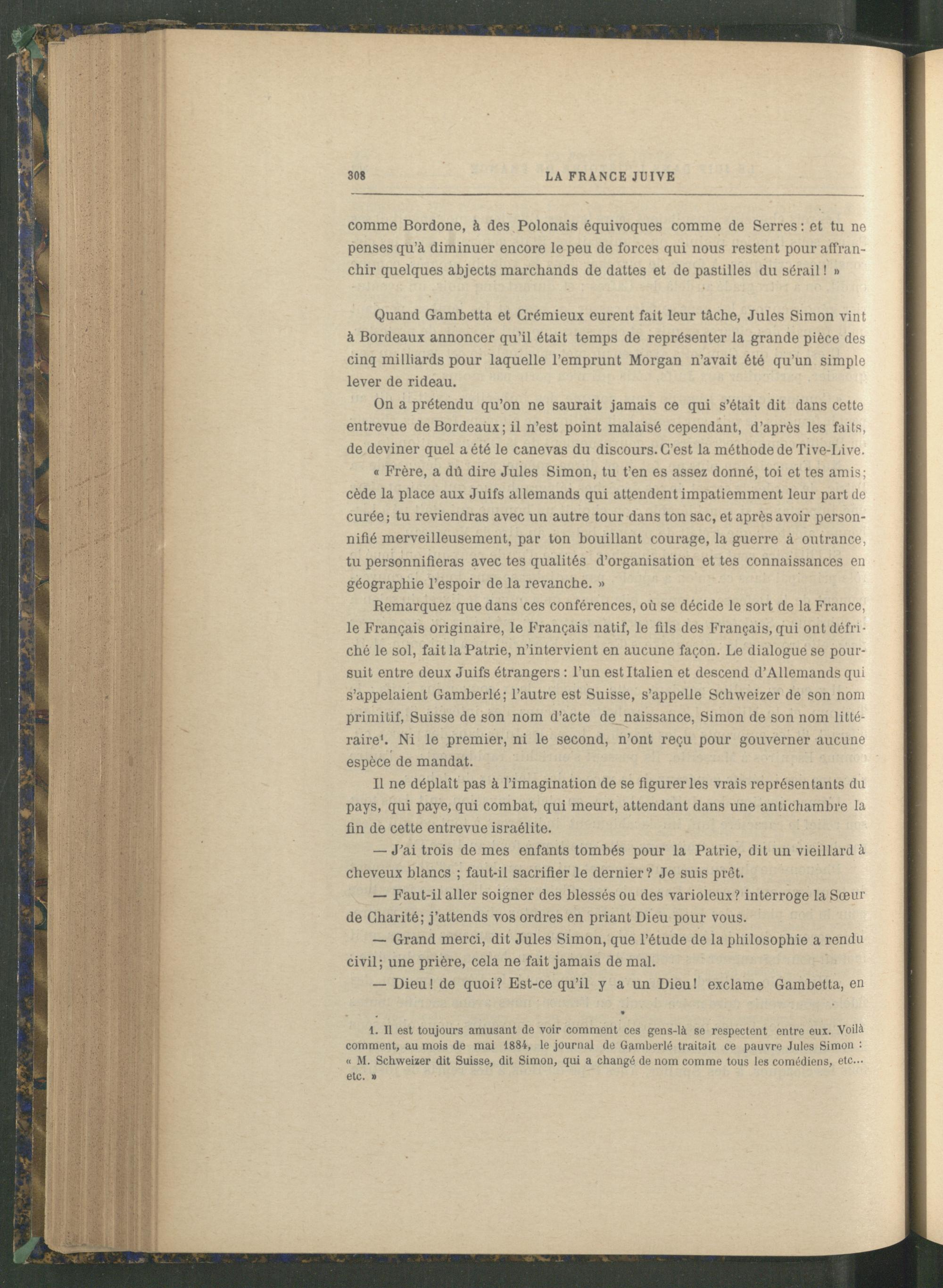 Remarquez que dans ces conférences, où se décide le sort de la France , le Français originaire, le Français natif, le fils des Français , qui ont défriché le sol, fait la Patrie, n’intervient en aucune façon. Le dialogue se poursuit entre deux Juifs étrangers : l’un est Italien et descend d’Allemands qui s’appelaient Gamberlé; l’autre est Suisse , s’appelle Schweizer de son nom primitif, Suisse de son nom d’acte de naissance, Simon de son nom littéraire 1 . Ni le premier, ni le second, n’ont reçu pour gouverner aucune espèce de mandat.
