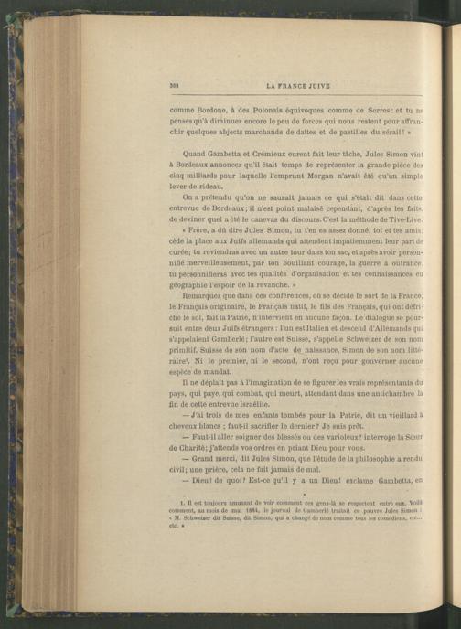 « Frère, a dû dire Jules Simon , tu t’en es assez donné, toi et tes amis; cède la place aux Juifs allemands qui attendent impatiemment leur part de curée; tu reviendras avec un autre tour dans ton sac, et après avoir personnifié merveilleusement, par ton bouillant courage, la guerre à outrance, tu personnifieras avec tes qualités d’organisation et tes connaissances en géographie l’espoir de la revanche. »