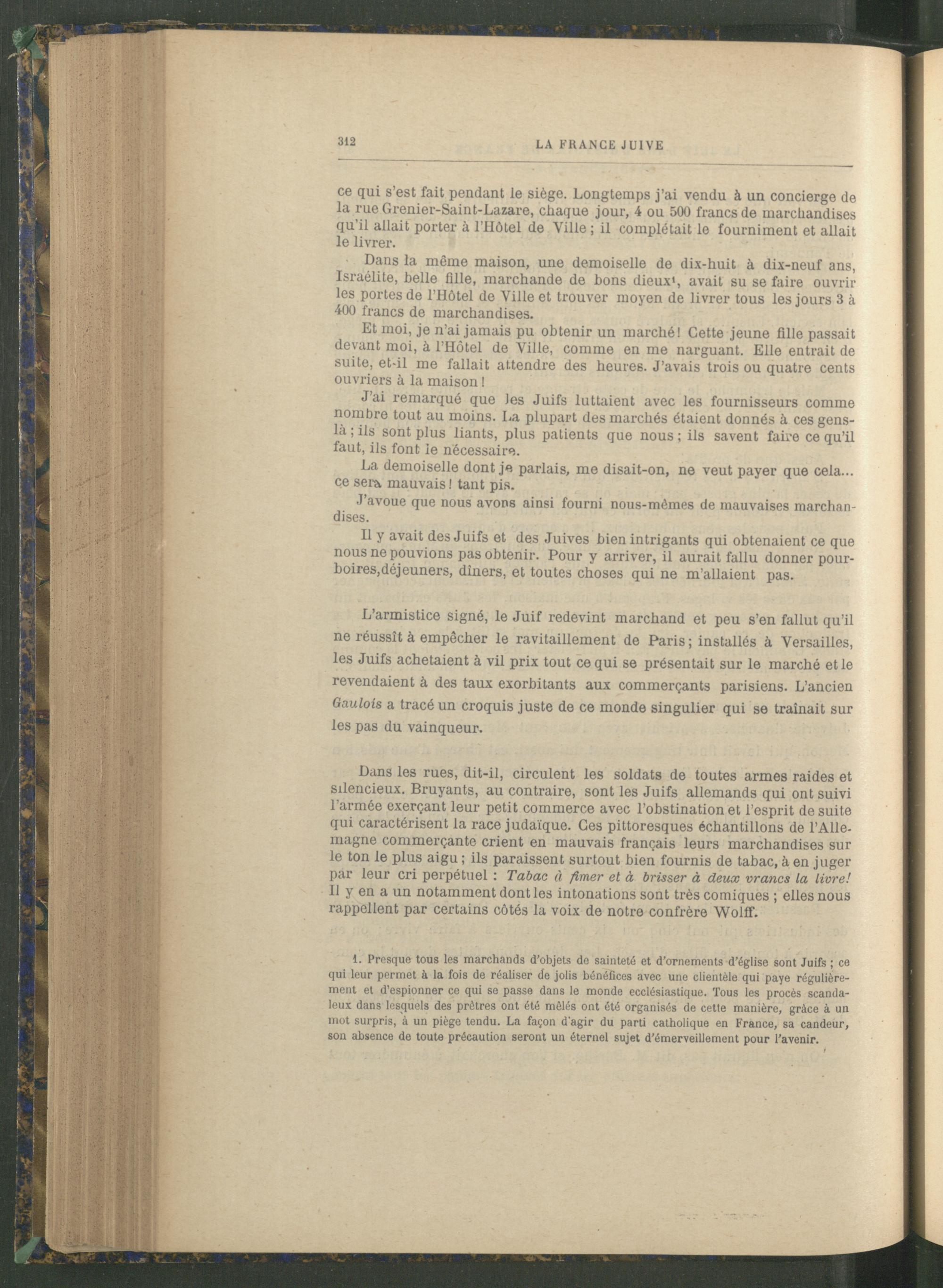 1. Presque tous les marchands d’objets de sainteté et d’ornements d’église sont Juifs ; ce qui leur permet à la fois de réaliser de jolis bénéfices avec une clientèle qui paye régulièrement et d’espionner ce qui se passe dans le monde ecclésiastique. Tous les procès scandaleux dans lesquels des prêtres ont été mêlés ont été organisés de cette manière, grâce à un mot surpris, à un piège tendu. La façon d'agir du parti catholique en France , sa candeur, sou absence de toute précaution seront un éternel sujet d’émerveillement pour l’avenir.