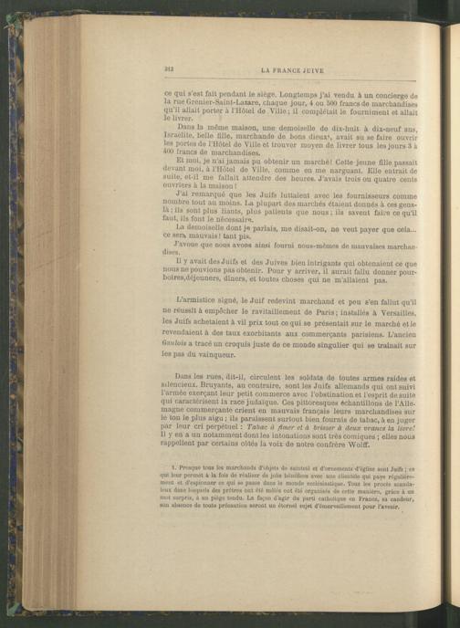 L’armistice signé, le Juif redevint marchand et peu s’en fallut qu’il ne réussît à empêcher le ravitaillement de Paris ; installés à Versailles , les Juifs achetaient à vil prix tout ce qui se présentait sur le marché et le revendaient à des taux exorbitants aux commerçants parisiens . L’ancien Gaulois a tracé un croquis juste de ce monde singulier qui se traînait sur les pas du vainqueur.