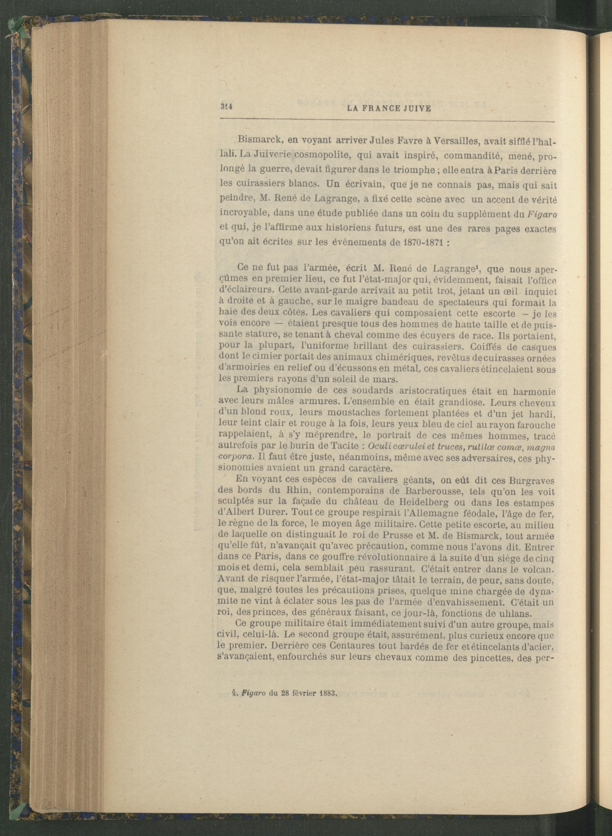 Bismarck, en voyant arriver Jules Favre à Versailles , avait sifflé l’hal- lali. La Juive"ie cosmopolite, qui avait inspiré, commandité, mené, prolongé la guerre, devait figurer dans le triomphe ; elle entra à Paris derrière les cuirassiers blancs. Un écrivain, que je ne connais pas, mais qui sait peindre, M. René de Lagrange, a fixé cette scène avec un accent de vérité incroyable, dans une étude publiée dans un coin du supplément du Figaro et qui, je l’affirme aux historiens futurs, est une des rares pages exactes qu’on ait écrites sur les événements de 1870-1871 :