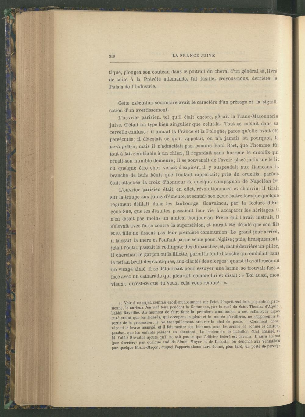 L’ouvrier parisien, tel qu’il était encore, gênait la Franc-Maçonnerie juive . C’était un type bien singulier que celui-là. Tout se mêlait dans sa cervelle confuse : il aimait la France et la Pologne , parce qu’elle avait été persécutée; il détestait ce qu’il appelait, on n’a jamais su pourquoi, le parti prêtre; mais il n’admettait pas, comme Paul Bert, que l’homme fût tout à fait semblable à un chien ; il regardait sans horreur le crucifix qui ornait son humble demeure; il se souvenait de l’avoir placé jadis sur le lit où quelque être cher venait d’expirer; il y suspendait aux Hameaux la branche de buis bénit que l’enfant rapportait ; près du crucifix, parfois était attachée la croix d’honneur de quelque compagnon de Napoléon I er .