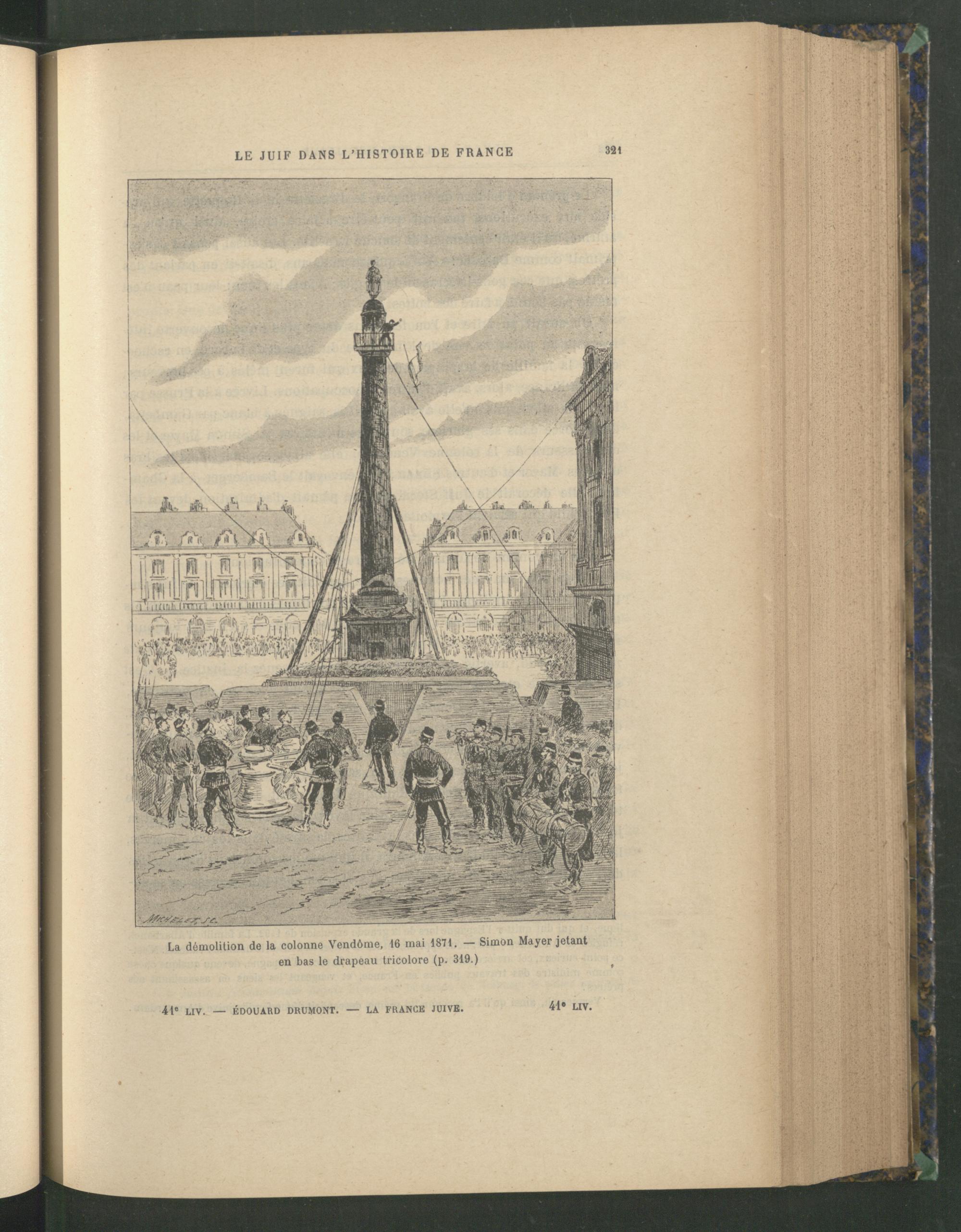 LE JUIF DANS L’HISTOIRE DE FRANGE 321 La démolition de la colonne Vendôme, 16 mai 1871. — Simon Mayer jetant en bas le drapeau tricolore (p. 319.) 41" LIV. — ÉDOUARD DRUMONT . — LA FRANCE JUIVE. 41* LIV.