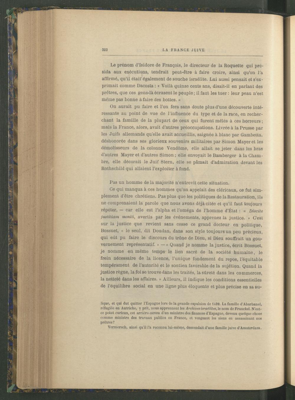 Le prénom d’Isidore de François, le directeur de la Roquette qui présida aux exécutions, tendrait peut-être à faire croire, ainsi qu’on Fa affirmé, qu’il était'également de souche israélite. Lui aussi pensait et s’exprimait comme Dacosta : « Voilà quinze cents ans, disait-il en parlant des prêtres, que ces gens-là écrasent le peuple ; il faut les tuer : leur peau n’est même pas bonne à faire des hottes. »