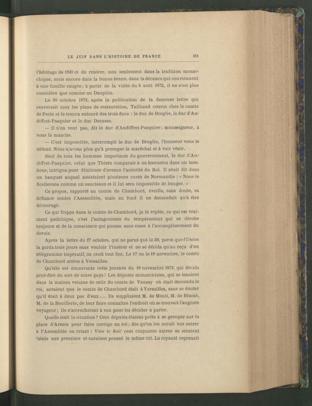 Le 30 octobre 1873, après la publication de la fameuse lettre qui renversait tous les plans de restauration, Tailhand courut chez le comte de Paris et le trouva entouré des trois ducs : le duc de Broglie, le duc d’Au- diffret-Pasquier et le duc Decazes .