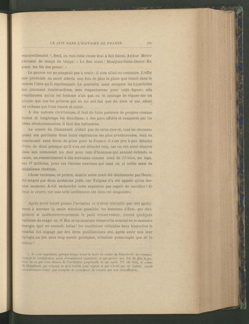 Le comte de Chambord n’était pas de cette race et, tout en encourageant ses partisans dans leurs espérances les plus aventureuses, tout en continuant sans doute de prier pour la France , il s’est peu à peu détaché d’elle. .le dirai presque qu’il s’en est détaché trop, car on eût aimé trouver dans son testament un mot pour tant d’hommes qui avaient défendu sa cause, un remerciement à des écrivains comme ceux de l’Union, un legs, sur 17 millions, pour ces Cercles ouvriers qui sont un si noble essai de socialisme chrétien.