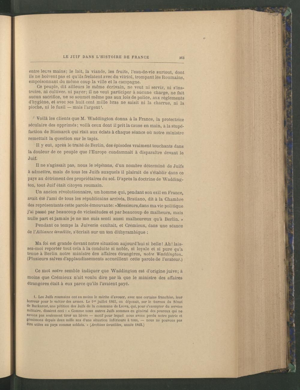 Il ne s’agissait pas, nous le répétons, d’un nombre déterminé de Juifs à admettre, mais de tous les Juifs auxquels il plairait de s’établir dans ce pays au détriment des propriétaires du sol. D’après la doctrine de Wadding ton , tout Juif était citoyen roumain.