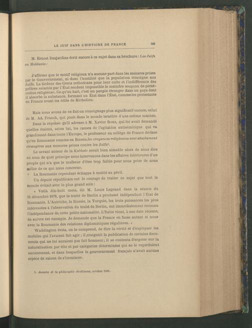 Dans la réponse qu’il adresse à M. Xavier Roux, qui lui avait demandé quelles étaient, selon lui, les causes de l’agitation antisémitique qui va grandissant dans toute l’Europe, le professeur au collège de France déclare qu’en Roumanie comme en Russie,tes croyances religieuses sont absolument étrangères aux mesures prises contre les Juifs 1 .