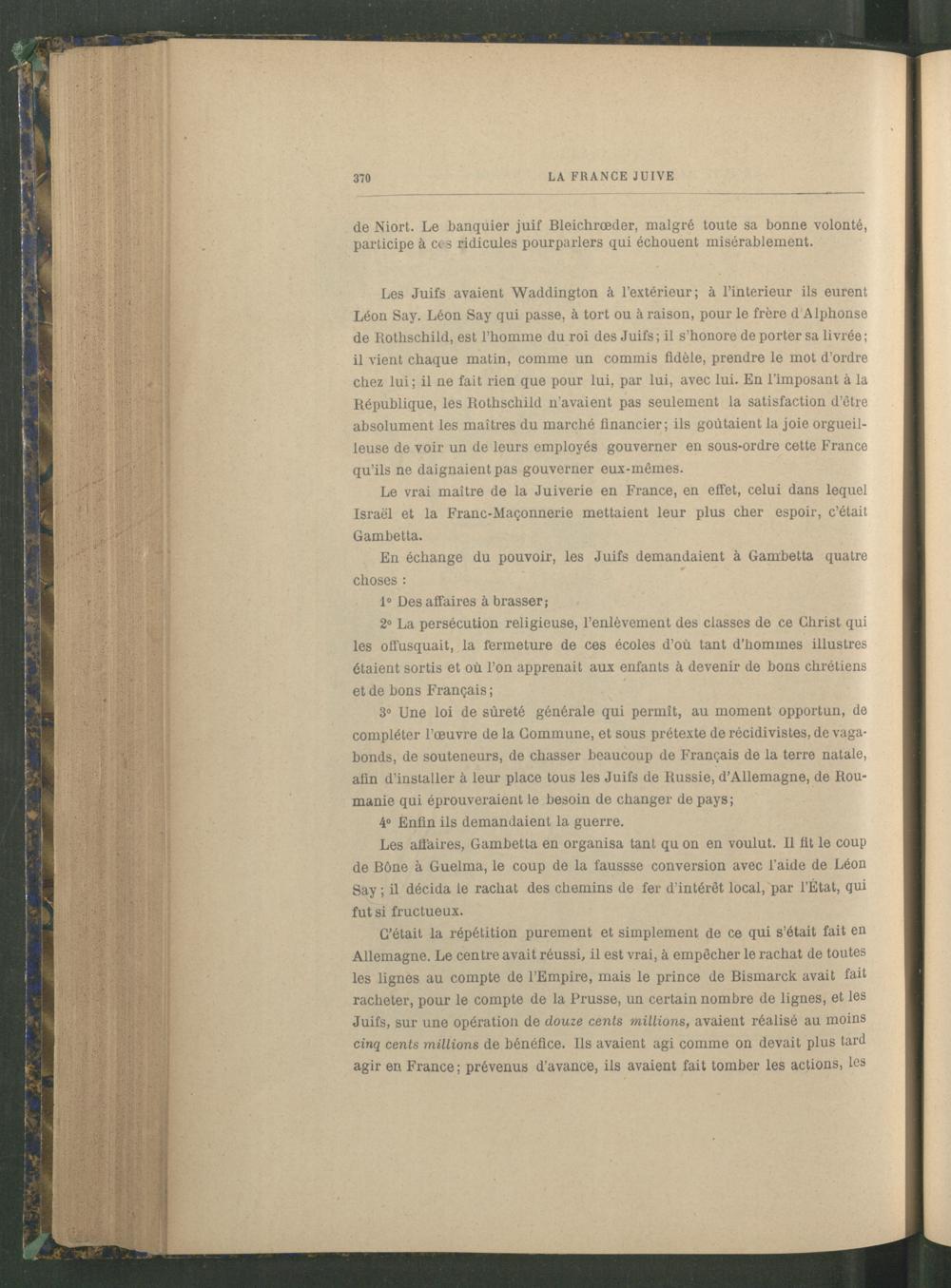 Les Juifs avaient Waddington à l’extérieur; à l’interieur ils eurent Léon Say . Léon Say qui passe, à tort ou à raison, pour le frère d Alphonse de Rothschild , est l’homme du roi des Juifs; il s’honore de porter sa livrée; il vient chaque matin, comme un commis fidèle, prendre le mot d’ordre chez lui; il ne fait rien que pour lui, par lui, avec lui. En l’imposant à la République , les Rothschild n'avaient pas seulement la satisfaction d’être absolument les maîtres du marché financier; ils goûtaient la joie orgueilleuse de voir un de leurs employés gouverner en sous-ordre cette France qu’ils ne daignaient pas gouverner eux-mêmes.