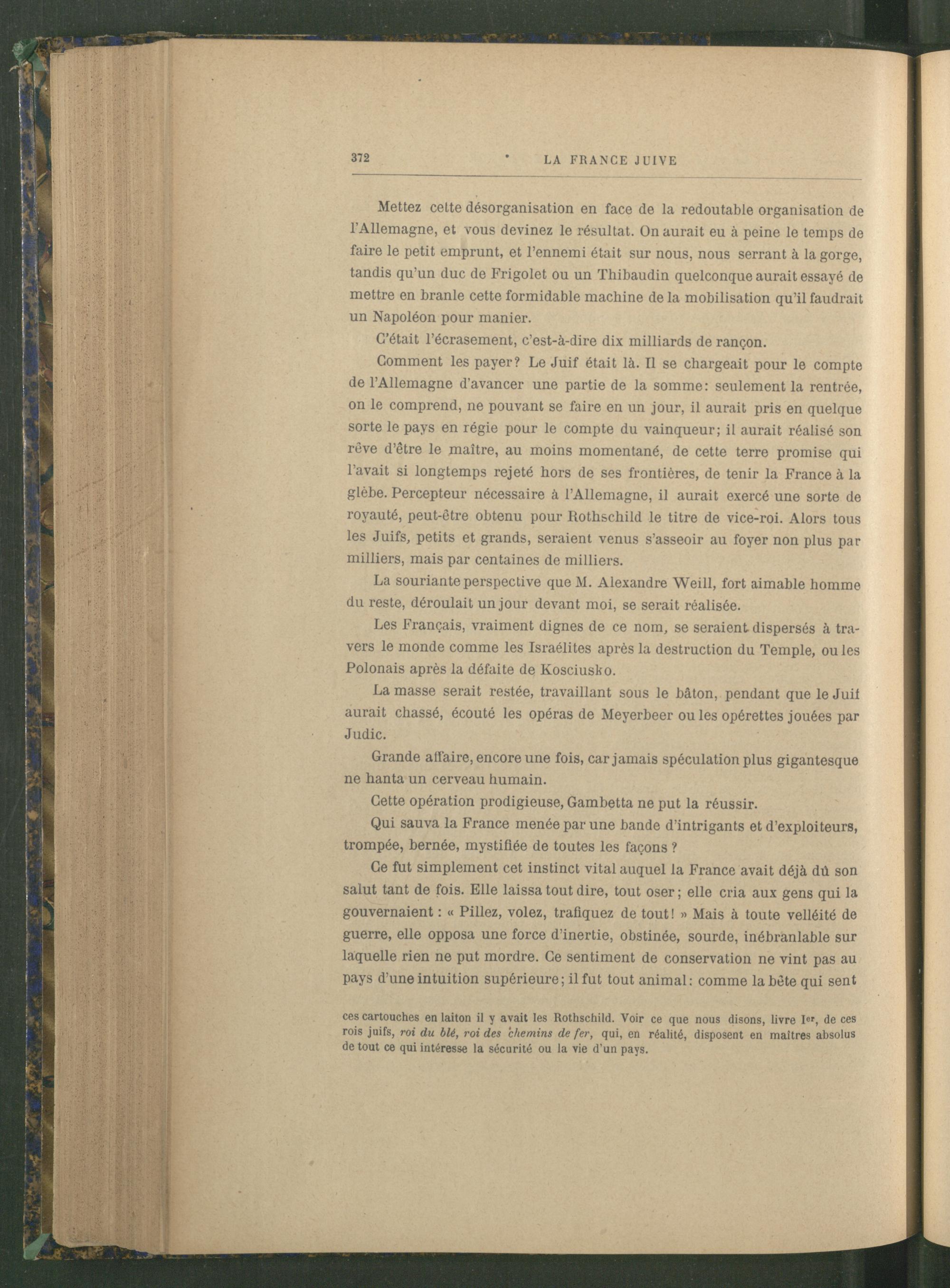 Comment les payer? Le Juif était là. Il se chargeait pour le compte de l’Allemagne d'avancer une partie de la somme: seulement la rentrée, on le comprend, ne pouvant se faire en un jour, il aurait pris en quelque sorte le pays en régie pour le compte du vainqueur; il aurait réalisé son rêve d’être le maître, au moins momentané, de cette terre promise qui l’avait si longtemps rejeté hors de ses frontières, de tenir la France à la glèbe. Percepteur nécessaire à l’Allemagne , il aurait exercé une sorte de royauté, peut-être obtenu pour Ilothschild le titre de vice-roi. Alors tous les Juifs, petits et grands, seraient venus s’asseoir au foyer non plus par milliers, mais par centaines de milliers.