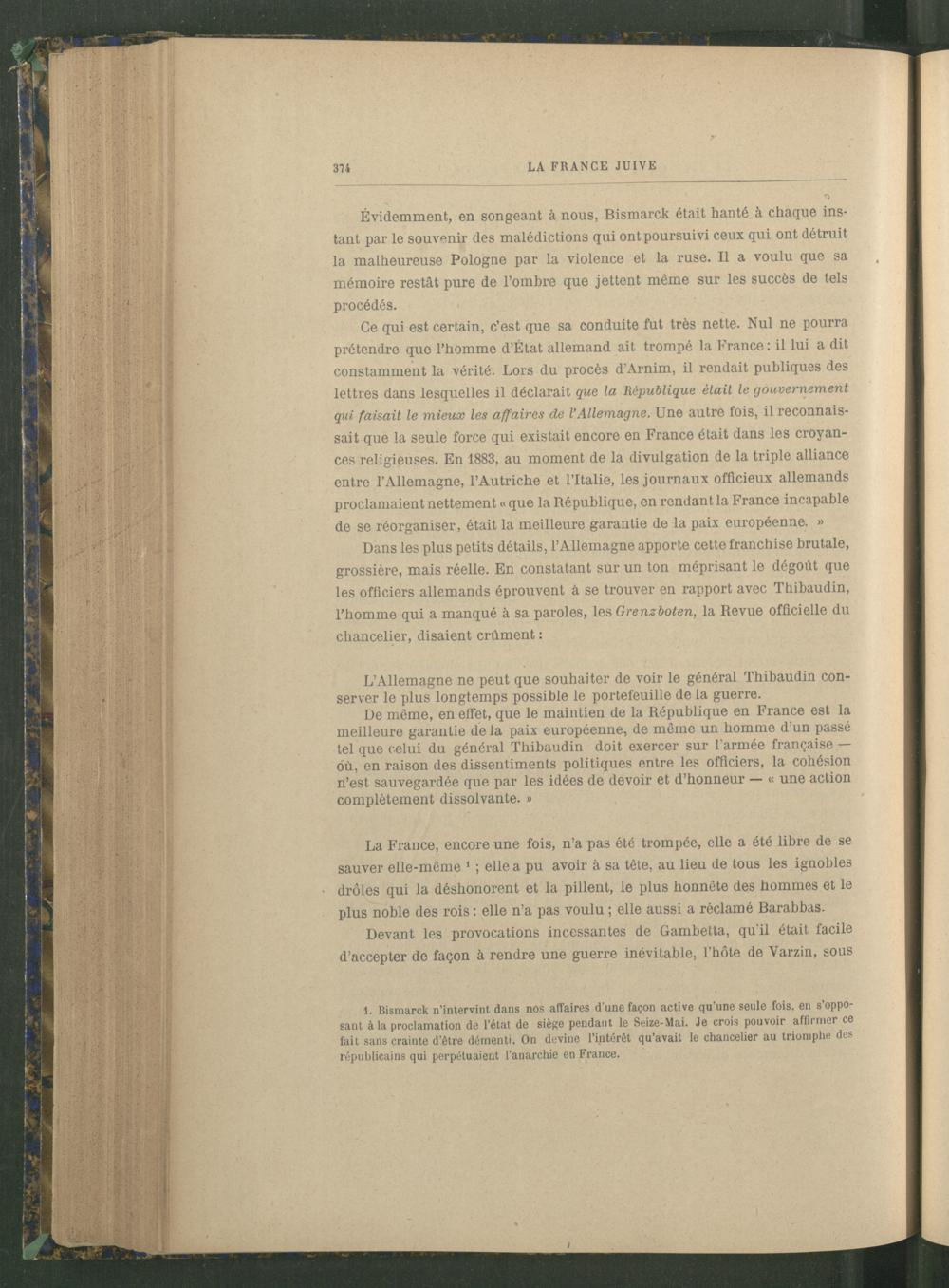 Dans les plus petits détails, l’Allemagne apporte cette franchise brutale, grossière, mais réelle. En constatant sur un ton méprisant le dégoût que les officiers allemands éprouvent à se trouver en rapport avec Thibaudin, l’homme qui a manqué à sa paroles, les Grenzboten, la Revue officielle du chancelier, disaient crûment :