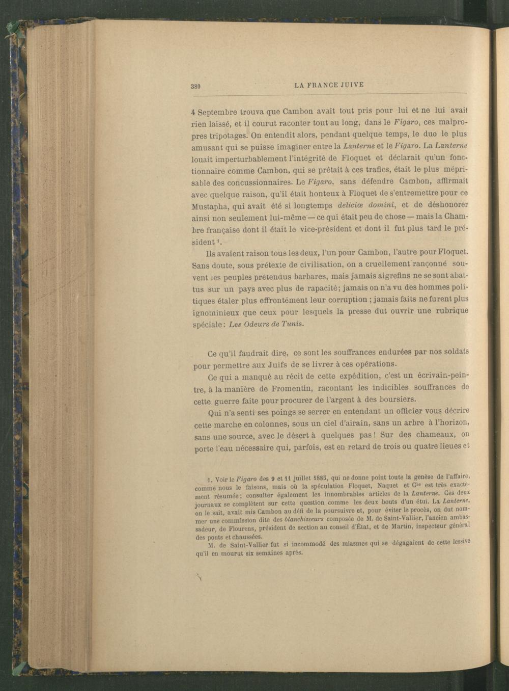 4 Septembre trouva que Cambon avait tout pris pour lui et ne lui avait rien laissé, et il courut raconter tout au long, dans le Figaro , ces malpropres tripotages. On entendit alors, pendant quelque temps, le duo le plus amusant qui se puisse imaginer entre la Lanterne et le Figaro . La Lanterne louait imperturbablement l’intégrité de Floquet et déclarait qu’un fonctionnaire comme Cambon, qui se prêtait à ces trafics, était le plus méprisable des concussionnaires. Le Figaro , sans défendre Cambon, affirmait avec quelque raison, qu’il était honteux à Floquet de s’entremettre pour ce Mustapha, qui avait été si longtemps deliciœ domini, et de déshonorer ainsi non seulement lui-même — ce qui était peu de chose — mais la Chambre française dont il était le vice-président et dont il fut plus tard le président ’.