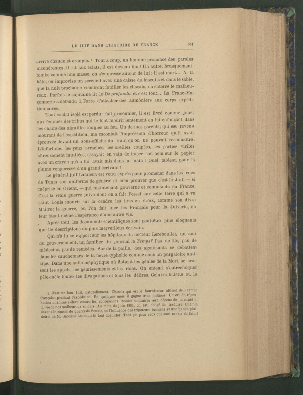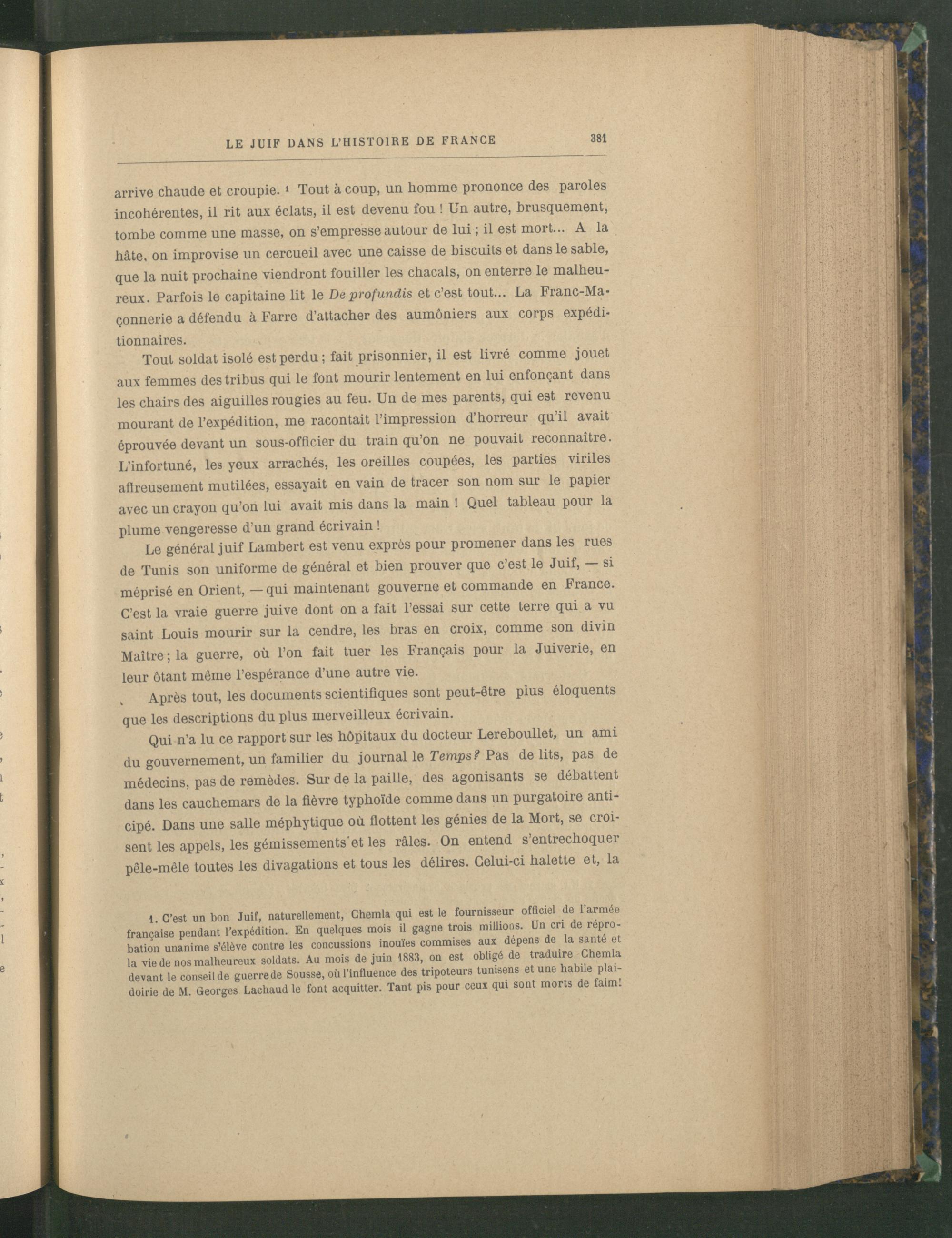 1. C’est un bon Juif, naturellement, Chemla qui est le fournisseur officiel de l’armée française pendant l’expédition. En quelques mois il gagne trois millions. Un cri de réprobation unanime s’élève contre les concussions inouïes commises aux dépens de la santé et la vie de nos malheureux soldats. Au mois de juin 1883, on est obligé de traduire Chemla devant le conseil de guerre de Sousse , où l’influence des tripoteurs tunisens et une habile plaidoirie de M. Georges Lachaud le font acquitter. Tant pis pour ceux qui sont morts de faim!