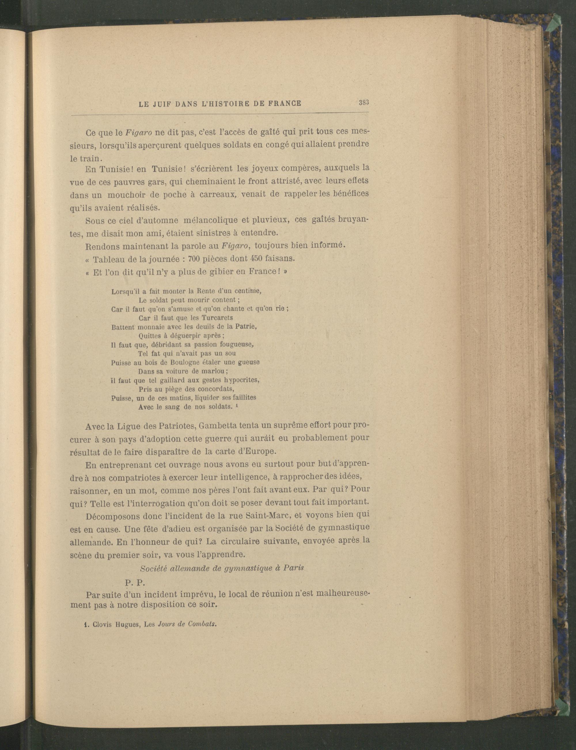 Décomposons donc l’incident de la rue Saint-Marc, et voyons bien qui est en cause. Une fête d’adieu est organisée par la Société de gymnastique allemande. En l’honneur de qui? La circulaire suivante, envoyée après la scène du premier soir, va vous l’apprendre.