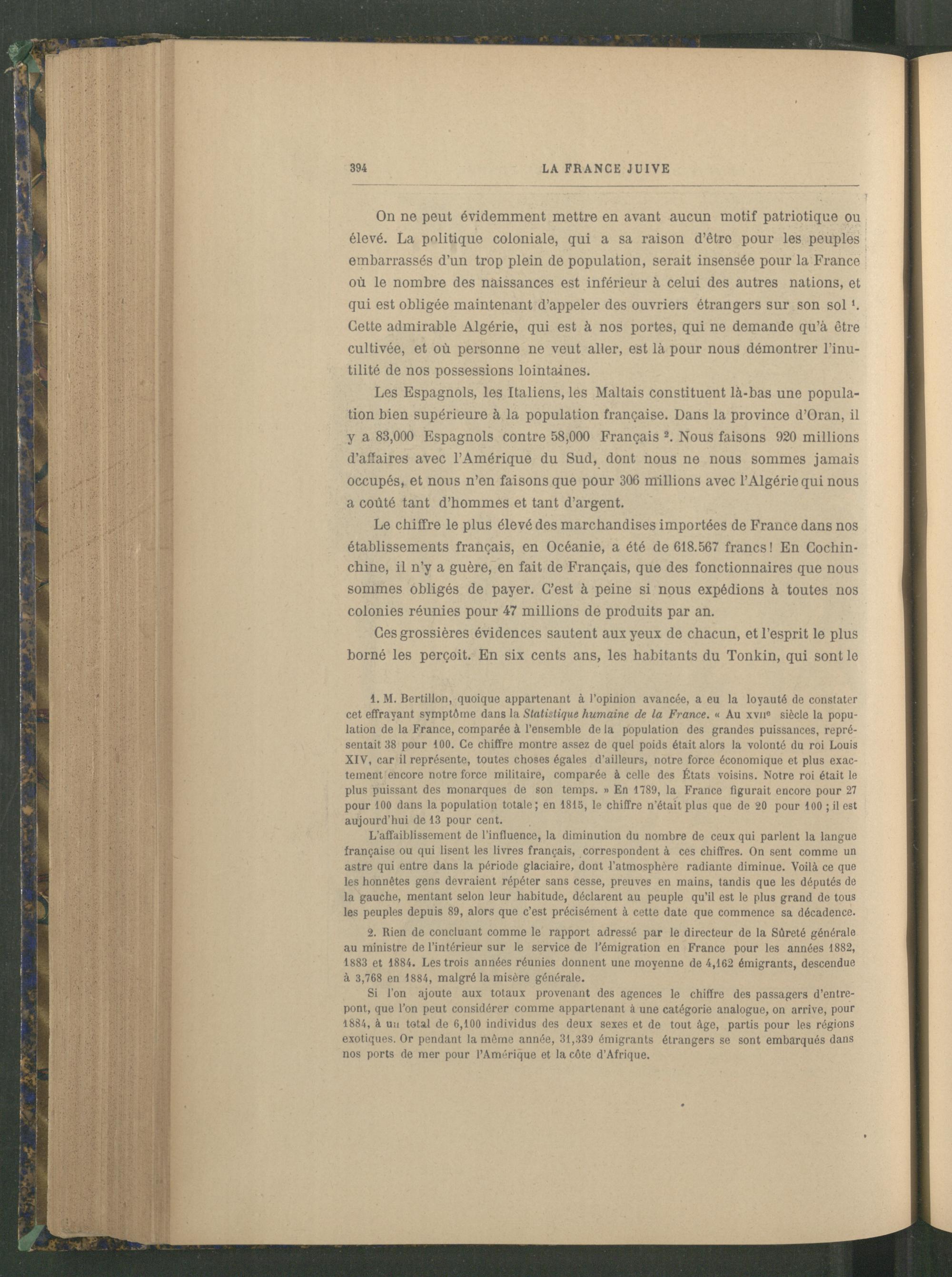 On ne peut évidemment mettre en avant aucun motif patriotique ou élevé. La politique coloniale , qui a sa raison d’êtro pour les peuples embarrassés d’un trop plein de population, serait insensée pour la France où le nombre des naissances est inférieur à celui des autres nations, et qui est obligée maintenant d’appeler des ouvriers étrangers sur son sol *. Cette admirable Algérie , qui est à nos portes, qui ne demande qu’à être cultivée, et où personne ne veut aller, est là pour nous démontrer l’inutilité de nos possessions lointaines.