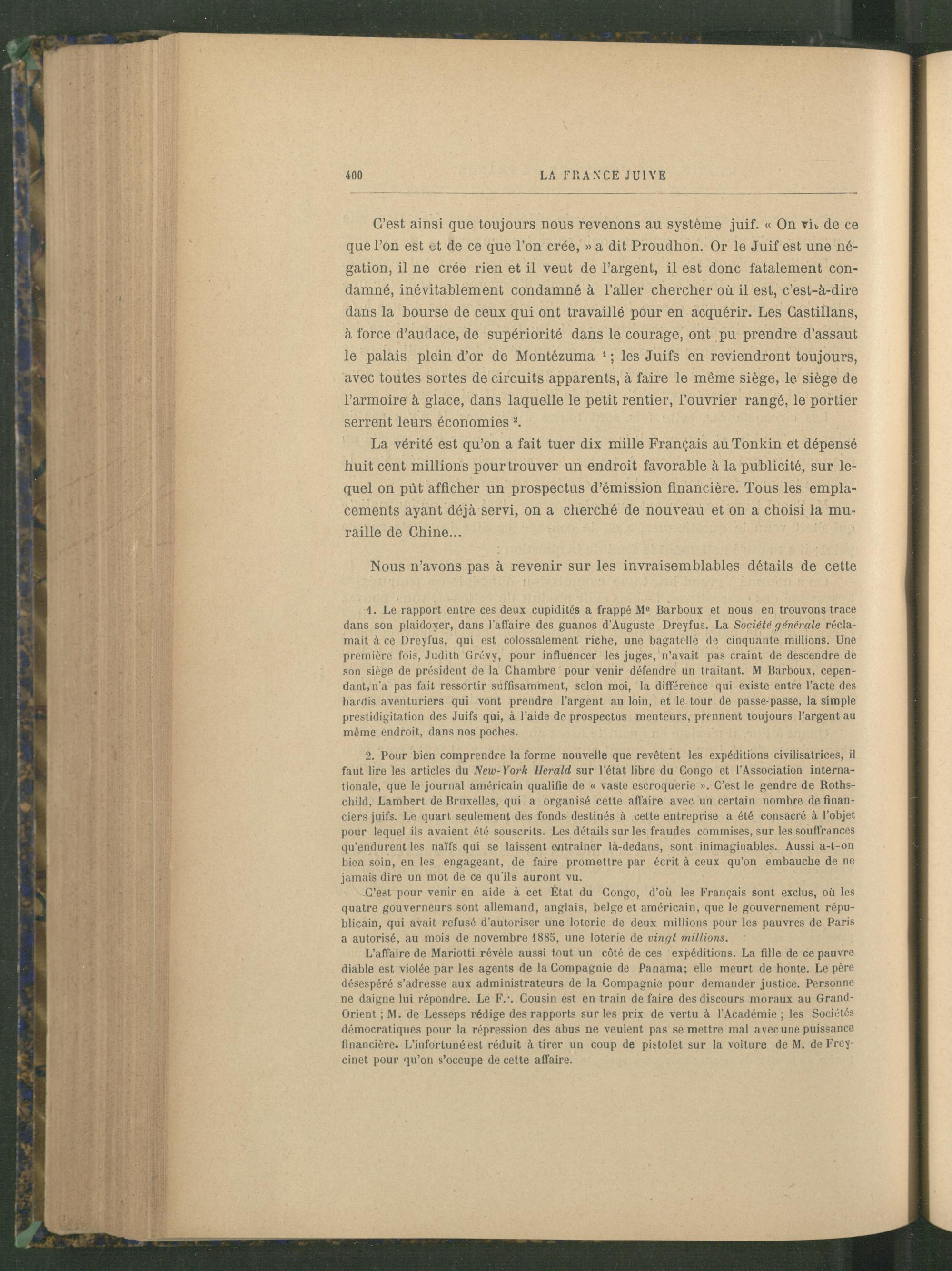 1. Le rapport entre ces deux cupidités a frappé M° Barboux et nous en trouvons trace dans son plaidoyer, dans l'affaire des guanos d’Auguste Dreyfus. La Société générale réclamait à ce Dreyfus, qui est colossalement riehe, une bagatelle de cinquante millions. Une première fois, Judith Grévy, pour influencer les juges, n’avait pas craint de descendre de son siège de président de la Chambre pour venir défendre un traitant. M Barboux, cependant, n’a pas fait ressortir suffisamment, selon moi, la différence qui existe entre l’acte des hardis aventuriers qui vont prendre l’argent au loin, et le tour de passe-passe, la simple prestidigitation des Juifs qui, à l’aide de prospectus menteurs, prennent toujours l’argent au même endroit, dans nos poches.