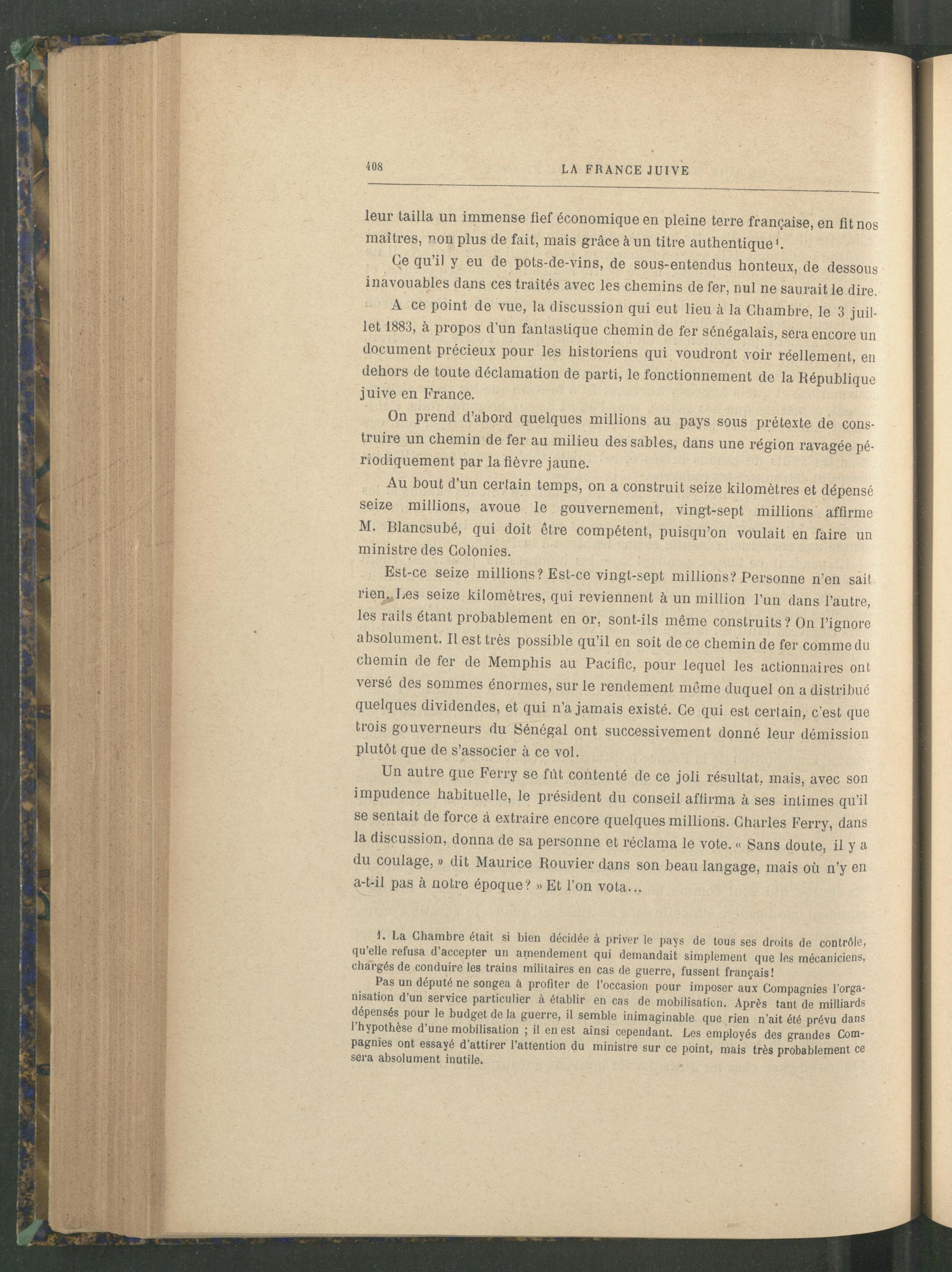 A ce point de vue, la discussion qui eut lieu à la Chambre, le 3 juillet 1883, à propos d'un fantastique chemin de fer sénégalais , sera encore un document précieux pour les historiens qui voudront voir réellement, en dehors de toute déclamation de parti, le fonctionnement de la République juive en France.