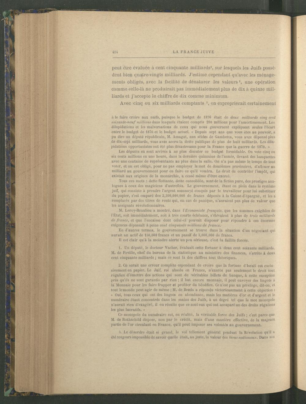 1. Un député, le docteur Vacher, évaluait cette fortune à deux cent soixante milliards. M. de Foville, chef du bureau de la statistique au ministère des finances, s'arrête à deux cent cinquante milliards ; mais ce sont là des chiffres tout théoriques.