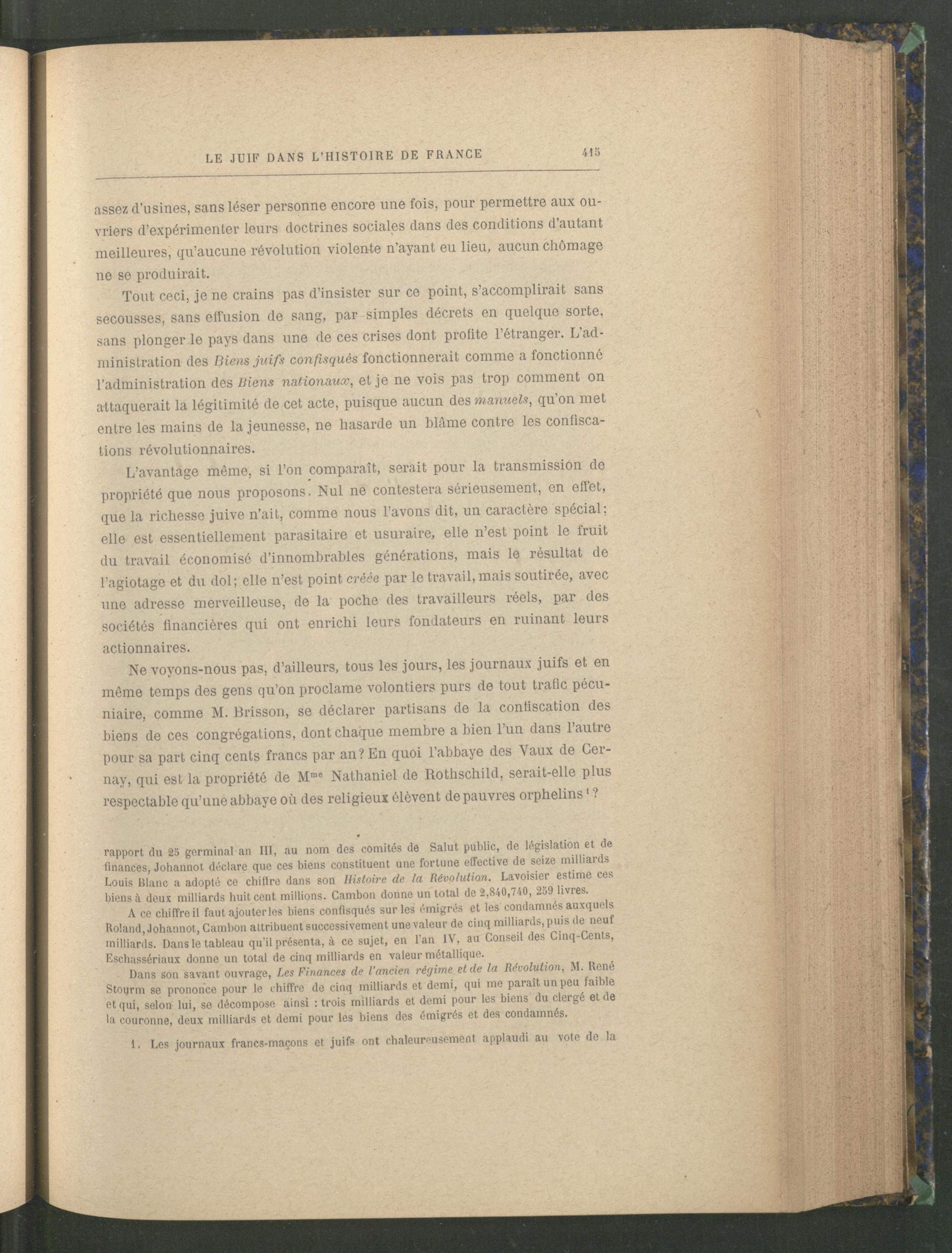 Ne voyons-nous pas, d’ailleurs, tous les jours, les journaux juifs et en même temps des gens qu’on proclame volontiers purs de tout trafic pécuniaire, comme M. Brisson, se déclarer partisans de la confiscation des biens de ces congrégations, dont chaque membre a bien l’un dans l’autre pour sa part cinq cents francs par an? En quoi l’abbaye des Vaux de Cer- nay, qui est la propriété de M me Nathaniel de Rothschild, serait-elle plus respectable qu’une abbaye où des religieux élèvent de pauvres orphelins 1 ?