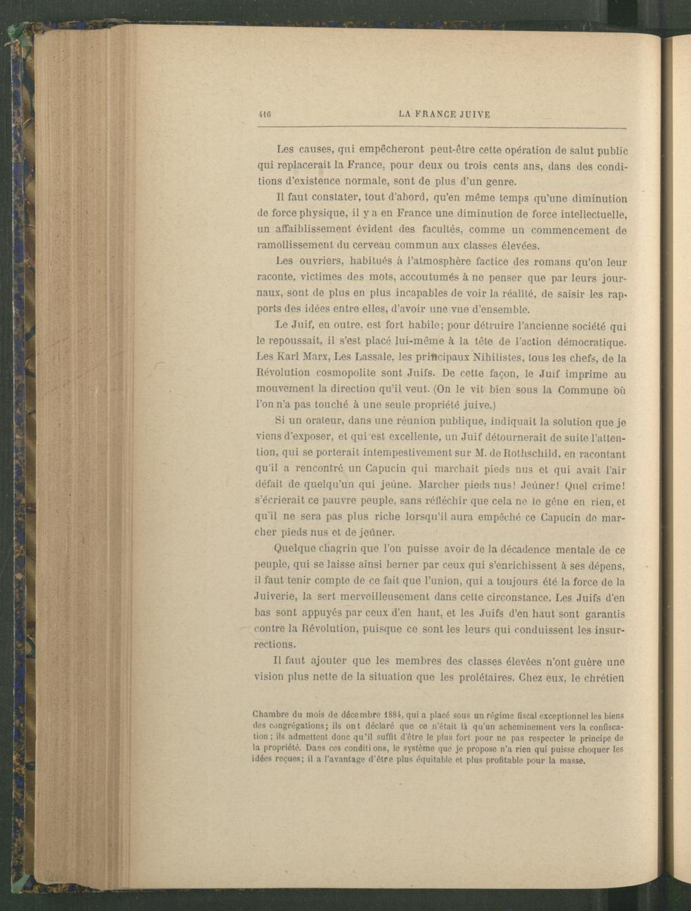 Le Juif, en outre, est fort habile; pour détruire l’ancienne société qui le repoussait, il s’est placé lui-même à la tête de l’action démocratique. Les Karl Marx , Les Lassale, les principaux Nihilistes, tous les chefs, de la Révolution cosmopolite sont Juifs. De cette façon, le Juif imprime au mouvement la direction qu’il veut. (On le vit bien sous la Commune où l’on n’a pas touché à une seule propriété juive .)