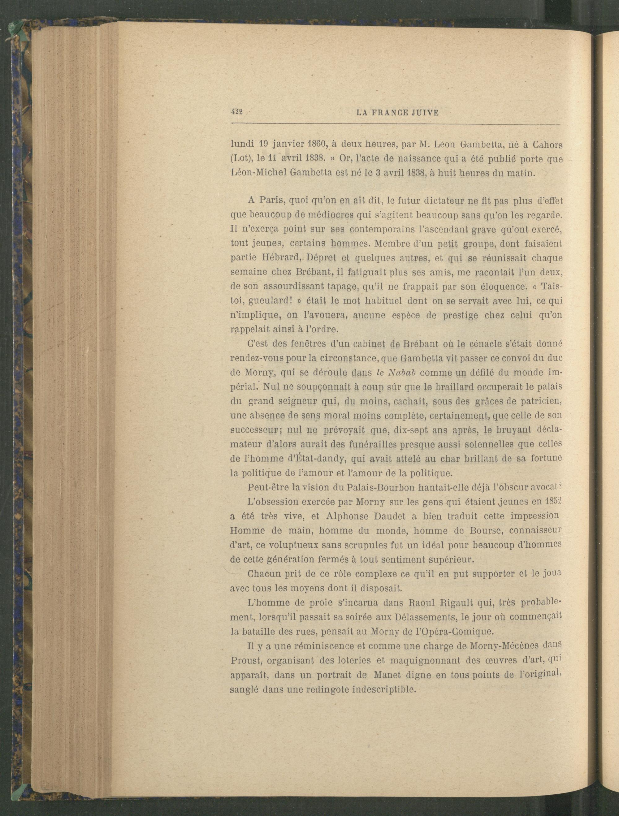 C’est des fenêtres d’un cabinet de Brébant où le cénacle s’était donné rendez-vous pour la circonstance, que Gambetta vit passer ce convoi du duc de Morny, qui se déroule dans le Nabab comme un défilé du monde impérial. Nul ne soupçonnait à coup sûr que le braillard occuperait le palais du grand seigneur qui, du moins, cachait, sous des grâces de patricien, une absence de sens moral moins complète, certainement, que celle de son successeur; nul ne prévoyait que, dix-sept ans après, le bruyant décla- mateur d’alors aurait des funérailles presque aussi solennelles que celles de l’homme d’État-dandy, qui avait attelé au char brillant de sa fortune la politique de l’amour et l’amour de la politique.