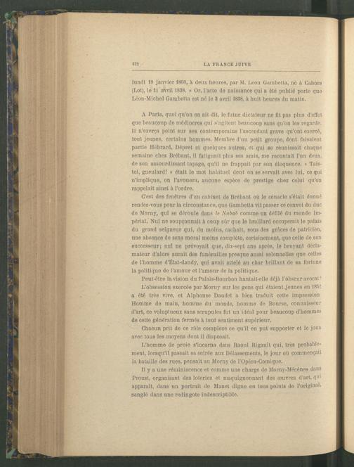 lundi 19 janvier 1860, à deux heures, par M. Leon Gambetta , né à Cahors (Lot ), le 11 avril 1838. » Or, l’acte de naissance qui a été publié porte que Léon-Michel Gambetta est né le 3 avril 1838, à huit heures du matin.