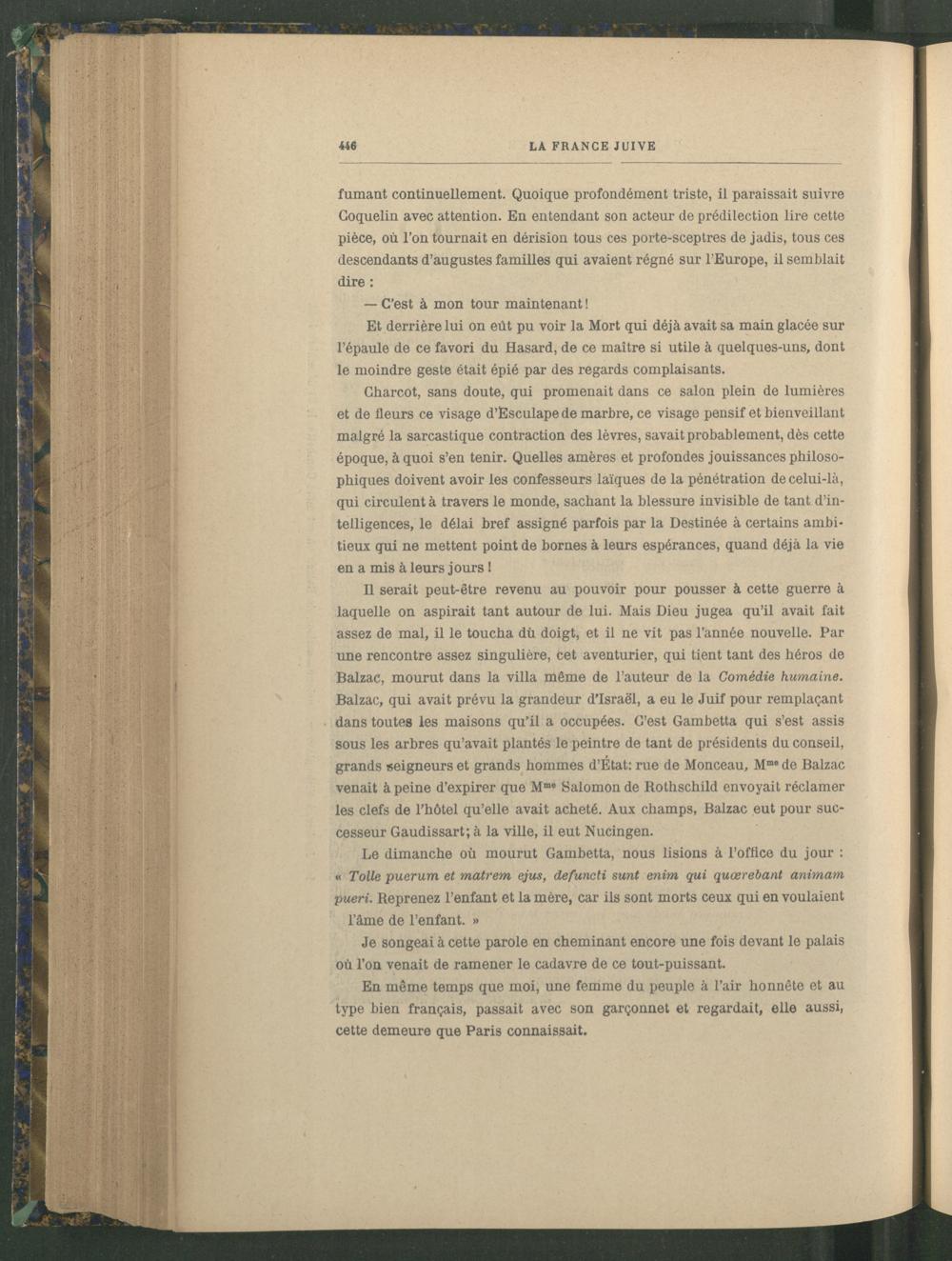Il serait peut-être revenu au pouvoir pour pousser à cette guerre à laquelle on aspirait tant autour de lui. Mais Dieu jugea qu’il avait fait assez de mal, il le toucha dû doigt, et il ne vit pas l’année nouvelle. Par une rencontre assez singulière, cet aventurier, qui tient tant des héros de Balzac, mourut dans la villa même de l’auteur de la Comédie humaine. Balzac , qui avait prévu la grandeur d’Israël , a eu le Juif pour remplaçant dans toutes les maisons qu’il a occupées. C’est Gambetta qui s’est assis sous les arbres qu’avait plantés le peintre de tant de présidents du conseil, grands seigneurs et grands hommes d’État: rue de Monceau, M me de Balzac venait à peine d’expirer que M me Salomon de Rothschild envoyait réclamer les clefs de l’hôtel qu’elle avait acheté. Aux champs, Balzac eut pour successeur Gaudissart; à la ville, il eut Nucingen.