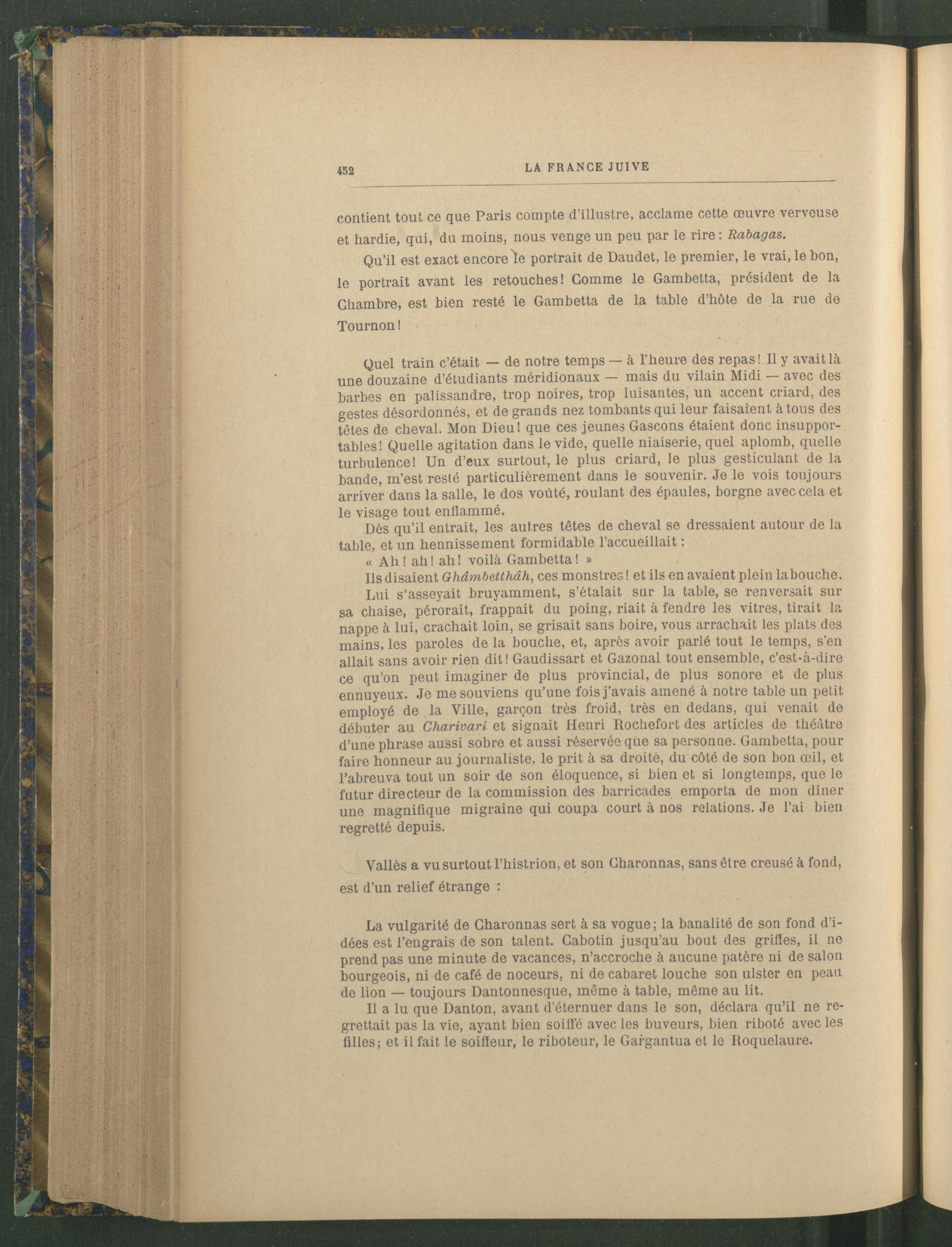 Quel train c’était — de notre temps — à l’heure des repas! Il y avait là une douzaine d’étudiants méridionaux — mais du vilain Midi — avec des barbes en palissandre, trop noires, trop luisantes, un accent criard, des gestes désordonnés, et de grands nez tombants qui leur faisaient à tous des tètes de cheval. Mon Dieu ! que ces jeunes Gascons étaient donc insupportables! Quelle agitation dans le vide, quelle niaiserie, quel aplomb, quelle turbulence! Un d’eux surtout, le plus criard, le plus gesticulant de la bande, m’est resté particulièrement dans le souvenir. Je le vois toujours arriver dans la salle, le dos voûté, roulant des épaules, borgne avec cela et le visage tout enflammé.