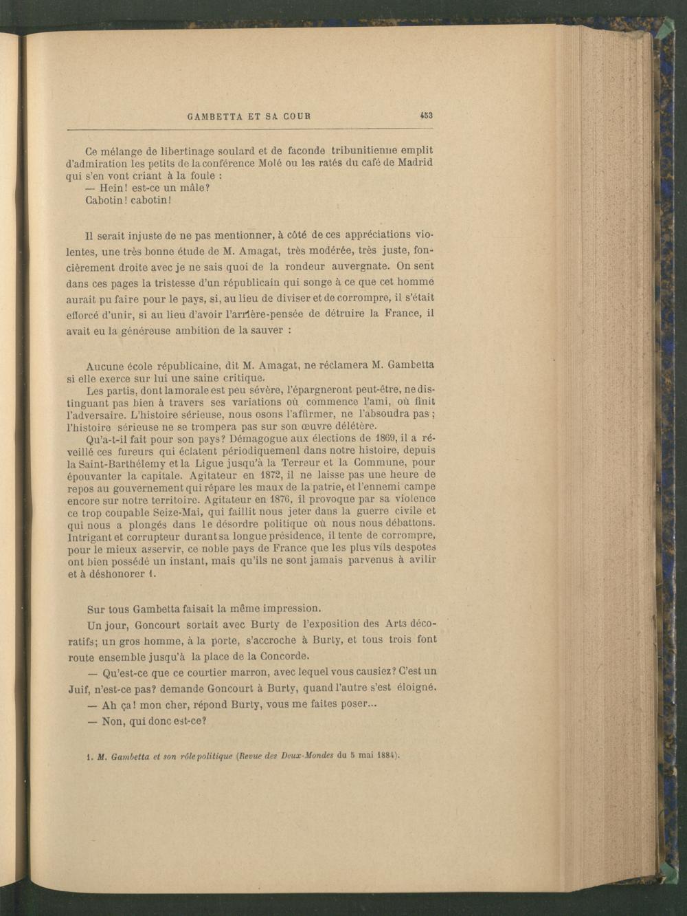 Il serait injuste de ne pas mentionner, à côté de ces appréciations violentes, une très bonne étude de M. Amagat, très modérée, très juste, foncièrement droite avec je ne sais quoi de la rondeur auvergnate. On sent dans ces pages la tristesse d’un républicain qui songe à ce que cet homme aurait pu faire pour le pays, si, au lieu de diviser et de corrompre, il s’était efforcé d’unir, si au lieu d’avoir l’arrlère-pensée de détruire la France , il avait eu la généreuse ambition de la sauver :