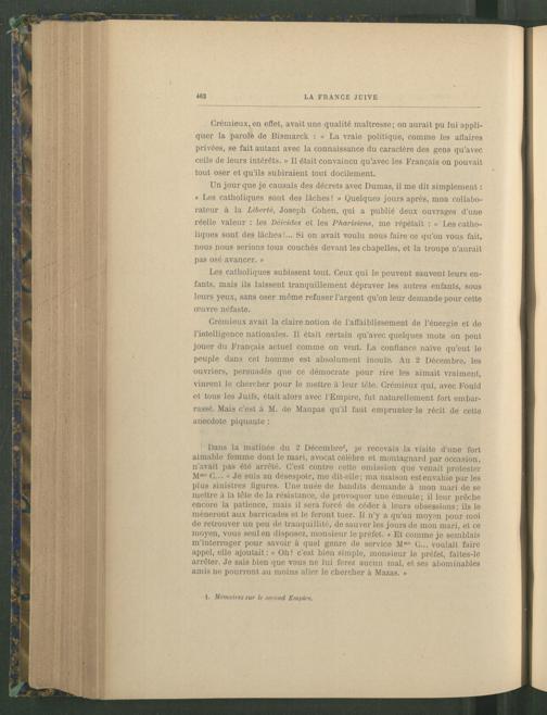 Crémieux avait la claire notion de l’affaiblissement de l’énergie et de l’intelligence nationales. Il était certain qu’avec quelques mots on peut jouer du Français actuel comme on veut. La confiance naïve qu’eut le peuple dans cet homme est absolument inouïe. Au 2 Décembre, les ouvriers, persuadés que ce démocrate pour rire les aimait vraiment, vinrent le chercher pour le mettre à leur tête. Crémieux qui, avec Fould et tous les Juifs, était alors avec l’Empire, fut naturellement fort embarrassé. Mais c’est à M. de Maupas qu’il faiit emprunter le récit de cette anecdote piquante :