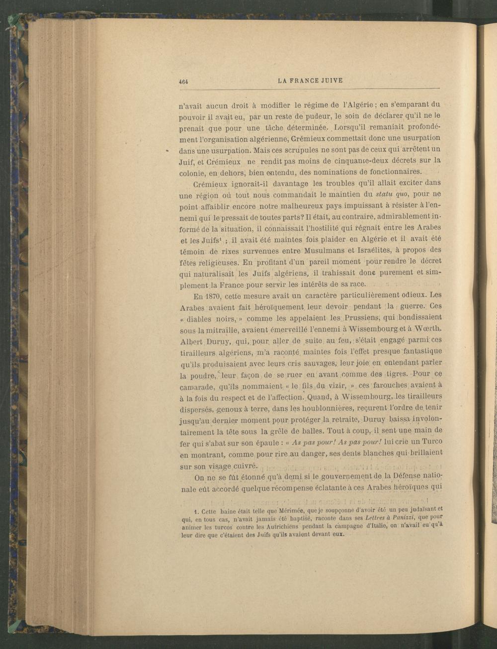 1. Cetle haine était telle que Mérimée , que je soupçonne d'avoir été un peu judaïsantet qui, en tous cas, n’avait jamais été baptisé, raconte dans ses Lettres à Panizzi , que pour animer les turcos contre les Autrichiens pendant la campagne d’Italie , on n’avait eu qu’à leur dire que c’étaient des Juifs qu’ils avaient devant eux.