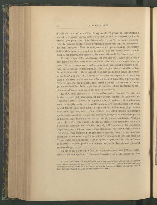 Crémieux ignorait-il davantage les troubles qu’il allait exciter dans une région où tout nous commandait le maintien du statu quo, pour ne point affaiblir encore notre malheureux pays impuissant à résister à l’ennemi qui le pressait de toutes parts? Il était, au contraire, admirablement informé de la situation, il connaissait l’hostilité qui régnait entre les Arabes et les Juifs 1 ; il avait été maintes fois plaider en Algérie et il avait été témoin de rixes survenues entre Musulmans et Israélites , à propos des fêtes religieuses. En profitant d’un pareil moment pour rendre le décret qui naturalisait les Juifs algériens, il trahissait done purement et simplement la France pour servir les intérêts de sa race.