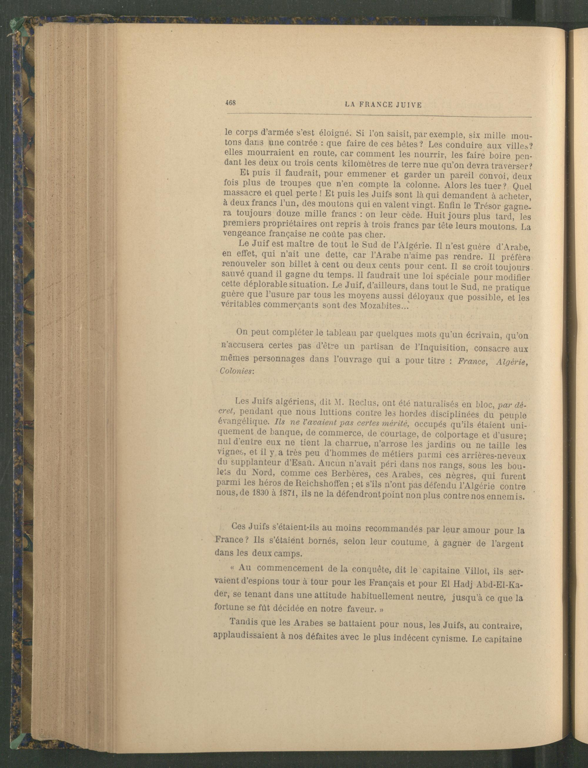 Les Juifs algériens, dit M. Reclus, ont été naturalisés en bloc, par décret, pendant que nous luttions contre les hordes disciplinées du peuple évangélique. Ils ne l'avaient pas certes mérité, occupés qu’ils étaient uniquement de banque, de commerce, de courtage, de colportage et d’usure; nul d'entre eux ne tient la charrue, n’arrose les jardins ou ne taille les vignes, et il y a très peu d’hommes de métiers parmi ces arrières-neveux du supplanteur d’Esaü . Aucun n’avait péri dans nos rangs, sous les boulets du Nord, comme ces Berbères, ces Arabes, ces nègres, qui furent parmi les héros de Reichshoffen ; et s'ils n’ont pas défendu l’Algérie contre nous, de 1830 à 1871, ils ne la défendront point non plus contre nos ennemis.