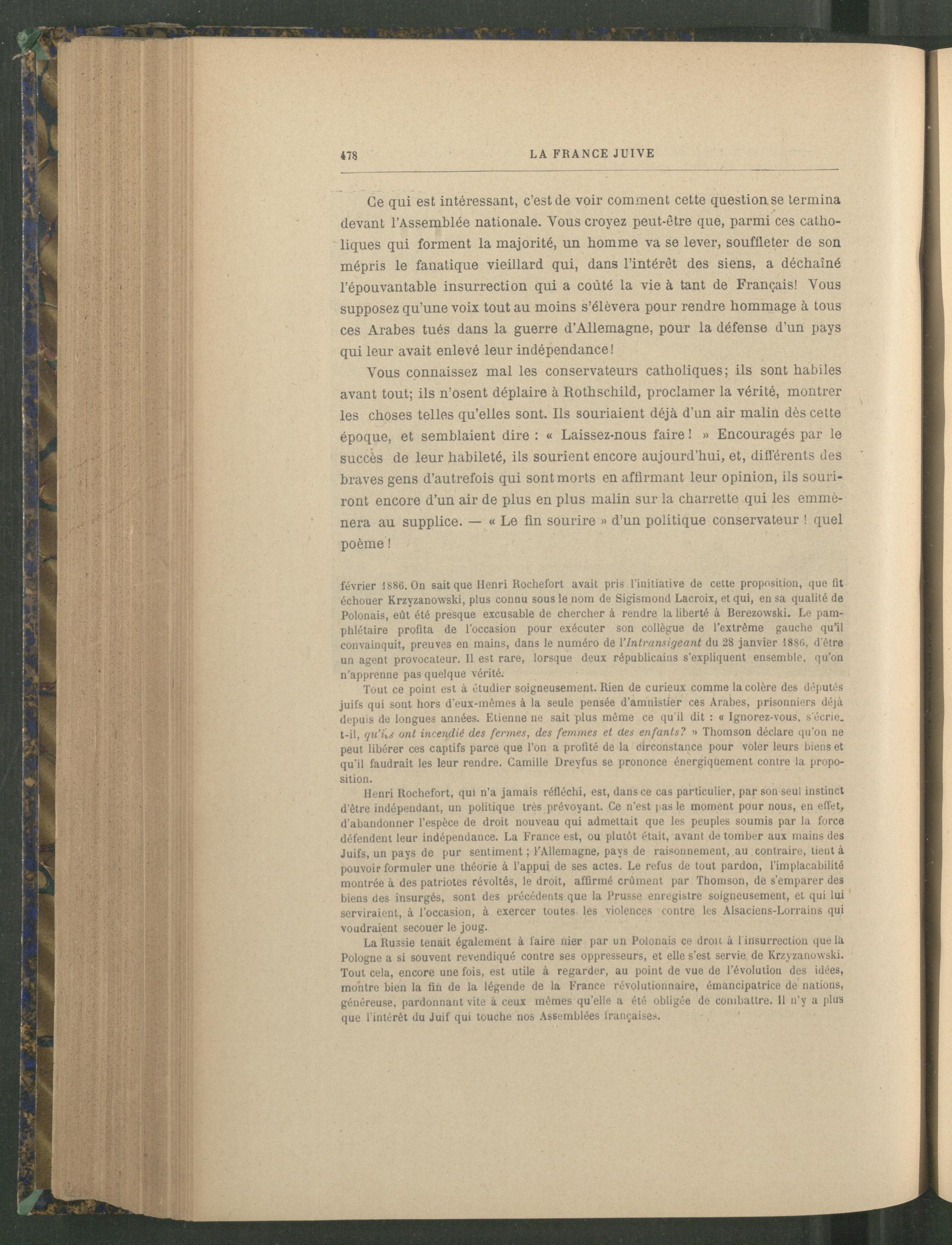 La Russie tenait également à faire nier par un Polonais ce droit à 1 insurrection que là Pologne a si souvent revendiqué contre ses oppresseurs, et elle s’est servie de Krzyzanowski. Tout cela, encore une fois, est utile à regarder, au point de vue de l’évolution des idées, montre bien la fin de la légende de la France révolutionnaire, émancipatrice de nations, généreuse, pardonnant vite à ceux mêmes qu’elle a été obligée de combattre. 11 n’y a plus que l'intérêt du Juif qui touche nos Assemblées françaises.