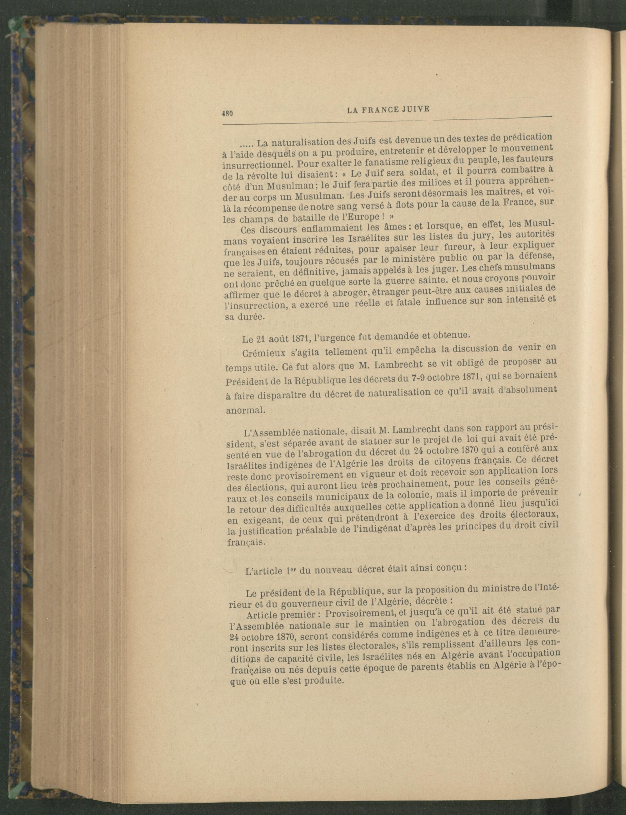Crémieux s’agita tellement qu'il empêcha la discussion de venir en temps utile. Ce fut alors que M. Lambrecht se vit obligé de proposer au Président de la République les décrets du 7-9 octobre 1871, qui se bornaient à faire disparaître du décret de naturalisation ce qu’il avait d’absolument anormal.
