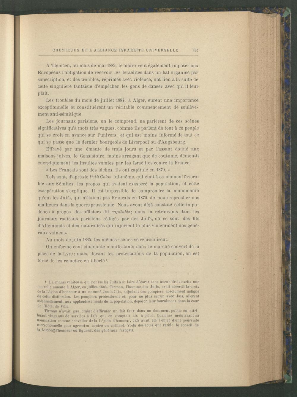 I. La mania vaniteuse qui pousse les Juifs à se faire décorer sans aucun droit excita une nouvelle émeute à Alger , eu juillet 1885. Tirman, l'homme des Juifs, avait accordé la croix de la Légion d’honneur à un nommé Jacob Jaïs, adjudant des pompiers, absolument indigne de cette distinction. Les pompiers protestèrent et, pour ne plus servir avec Jaïs, allèrent solennellement, aux applaudissements de la population, déposer leur fourniment dans la cour de l’Hôtel de Ville.
