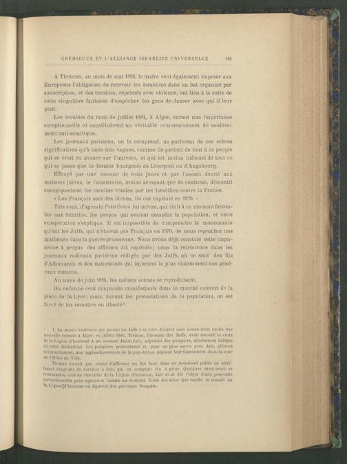 À Tlemcen , au mois de mai 1883, le maire veut également imposer aux Européens l’obligation de recevoir les Israélites dans un bal organisé par souscription, et des troubles, réprimés avec violence, ont lieu à la suite de cette singulière fantaisie d’empècher les gens de danser avec qui il leur plaît.