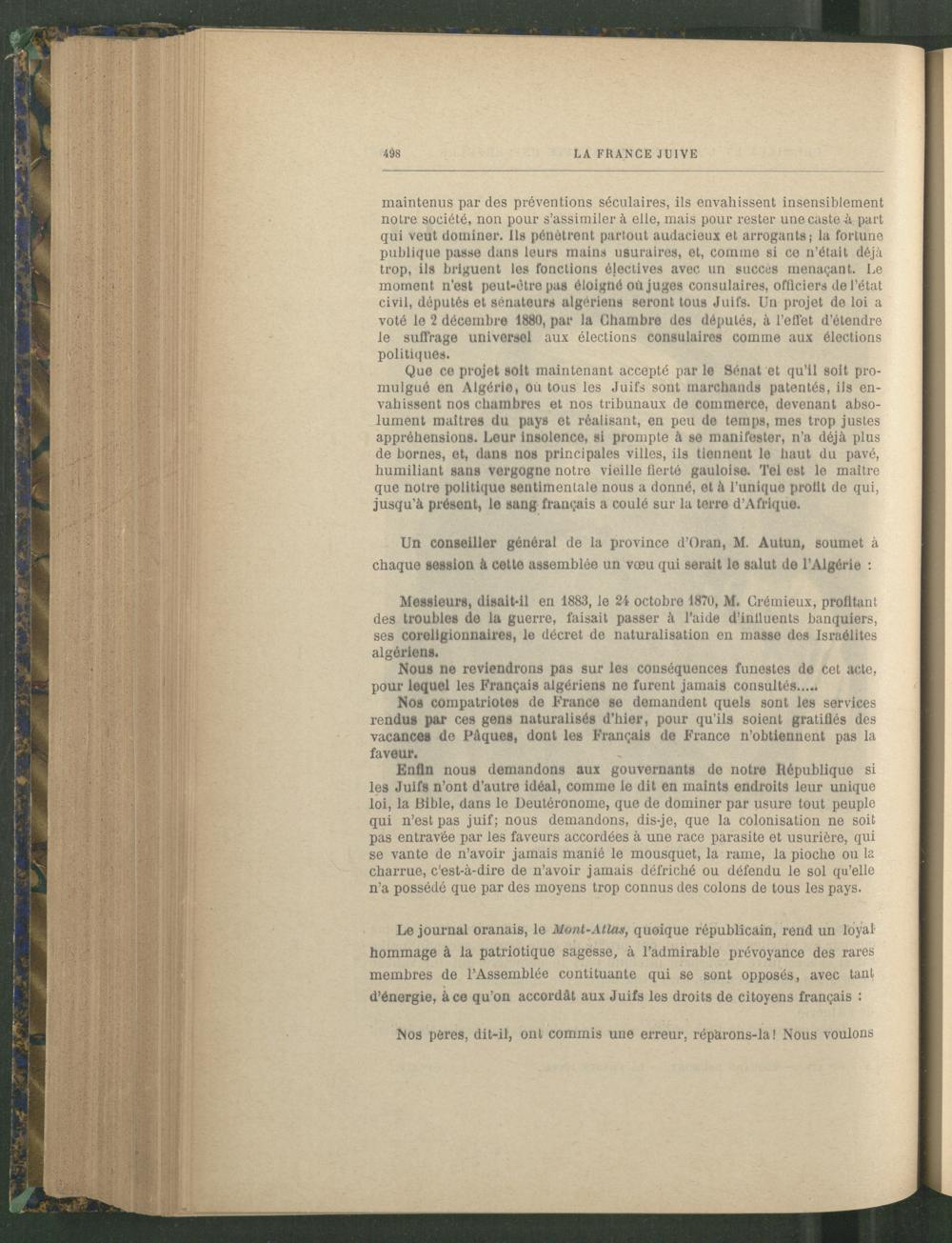 Le journal oranais, le Mont-Atlas, quoique républicain, rend un loyal hommage à la patriotique sagesse, à l’admirable prévoyance des rares membres de l’Assemblée contituante qui se sont opposés, avec tant d’énergie, à ce qu’on accordât aux Juifs les droits de citoyens français :