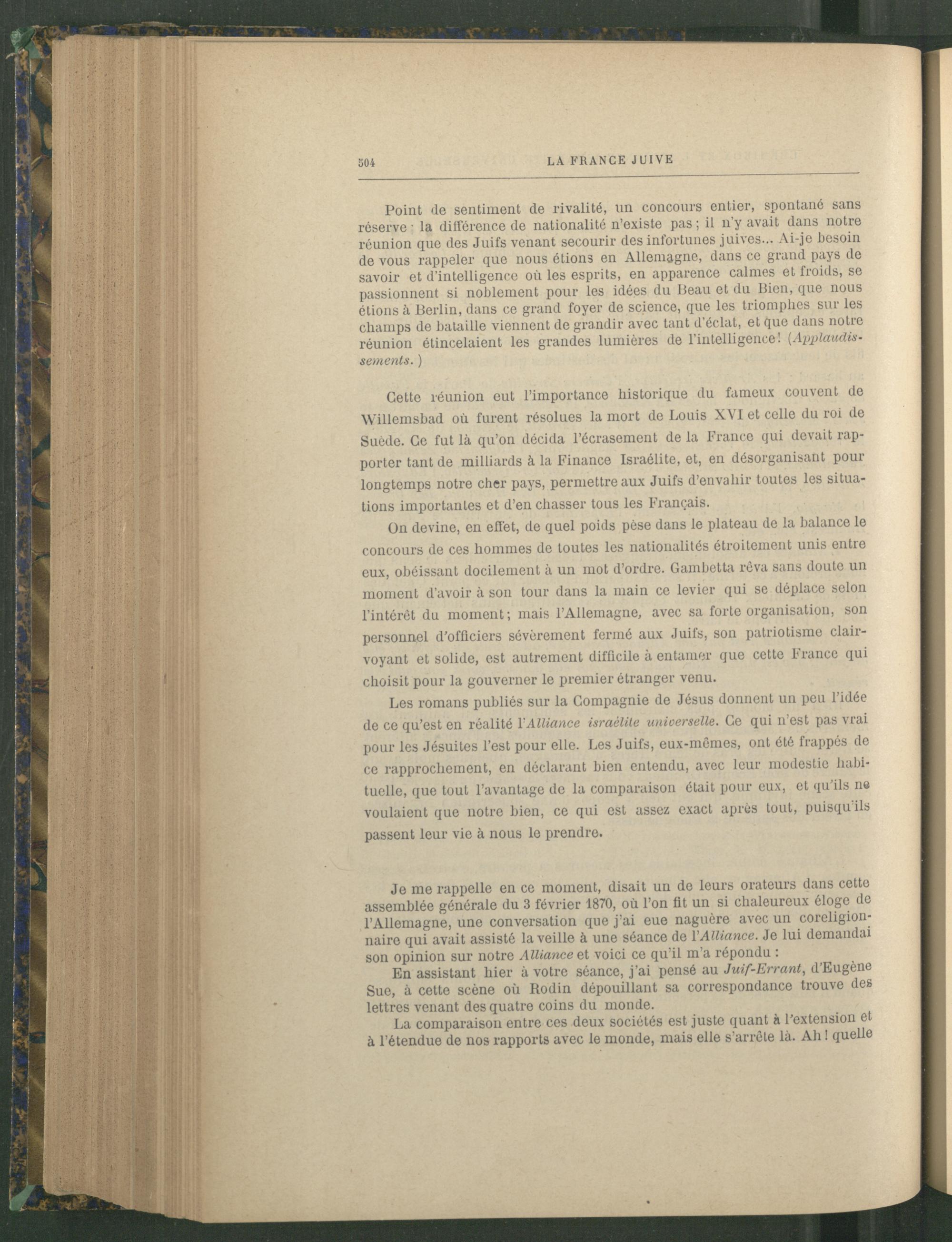 Cette réunion eut l’importance historique du fameux couvent de Willemsbad où furent résolues la mort de Louis XVI et celle du roi de Suède . Ce fut là qu’on décida l’écrasement de la France qui devait rapporter tant de milliards à la Finance Israélite, et, en désorganisant pour longtemps notre cher pays, permettre aux Juifs d’envahir toutes les situations importantes et d’en chasser tous les Français .