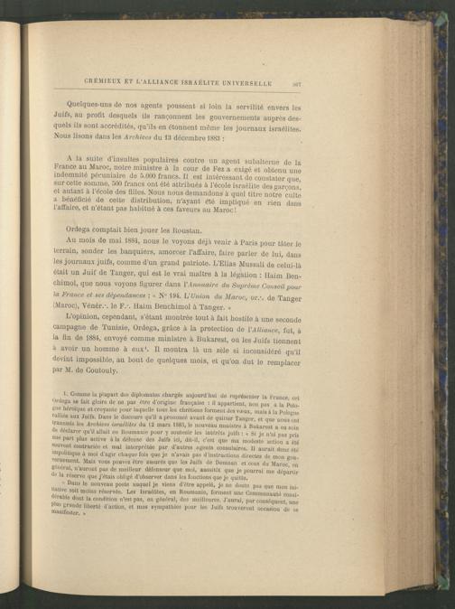Au mois de mai 1884, nous le voyons déjà venir à Paris pour tâter le terrain, sonder les banquiers, amorcer l’affaire, faire parler de lui, dans les journaux juifs, comme d’un grand patriote. L’Elias Mussali de celui-là était un Juif de Tanger , qui est le vrai maître à la légation : Haim Ben- cbimol, que nous voyons figurer dans VAnnuaire du Suprême Conseil pour la France et ses dépendances : « N° 194. L’Union du Maroc, or. - , de Tanger (Maroc ), Yénér. - . le F. - . Haim Benchimol à Tanger . »